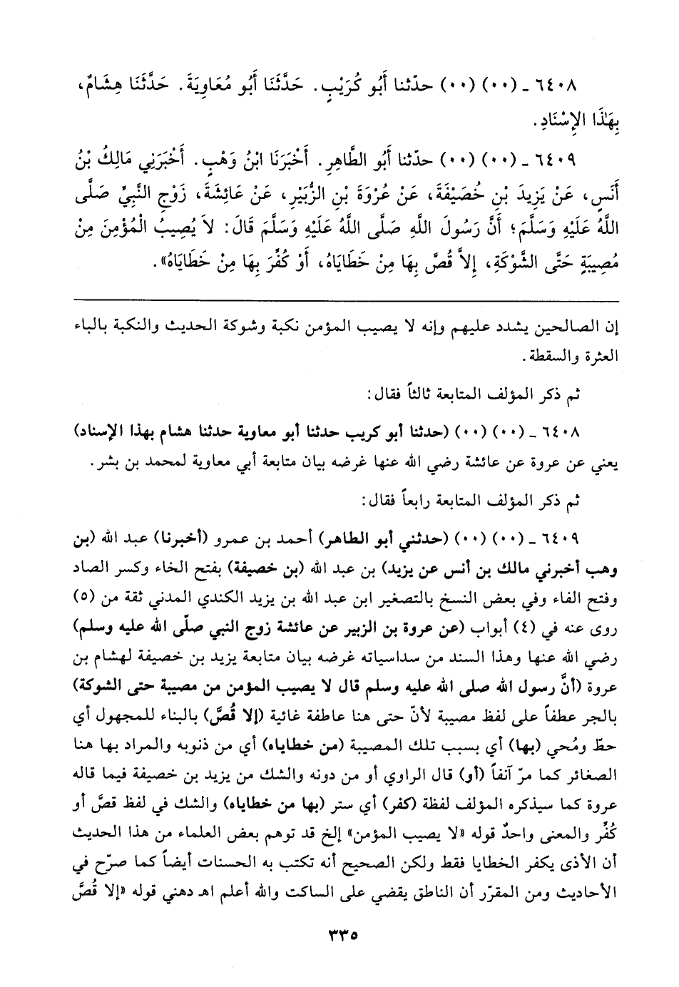 ٦٤٠٩ - (٠٠) (٠٠) حدَّثنا أَبُو الطَّاهِرِ. أَخْبَرَنَا ابْنُ وَهْبٍ. أَخْبَرَنِي مَالِكُ بْنُ أَنَسٍ، عَنْ يَزِيدَ بْنِ خُصَيفَةَ، عَنْ عُرْوَةَ بْنِ الزُّبَيرِ، عَنْ عَائِشَةَ، زَوْجِ النَّبِيِّ صَلَّى اللهُ عَلَيهِ وَسَلَّمَ؛ أَنَّ رَسُول اللهِ صَلَّى اللهُ عَلَيهِ وَسَلَّمَ قَال: لَا يُصِيبُ الْمُؤْمِنَ مِنْ مُصِيبَةٍ حَتَّى الشَّوْكَةِ، إلا قُصَّ بِهَا مِنْ خَطَايَاهُ، أَوْ كُفِّرَ بِهَا مِنْ خَطَايَاهُ"