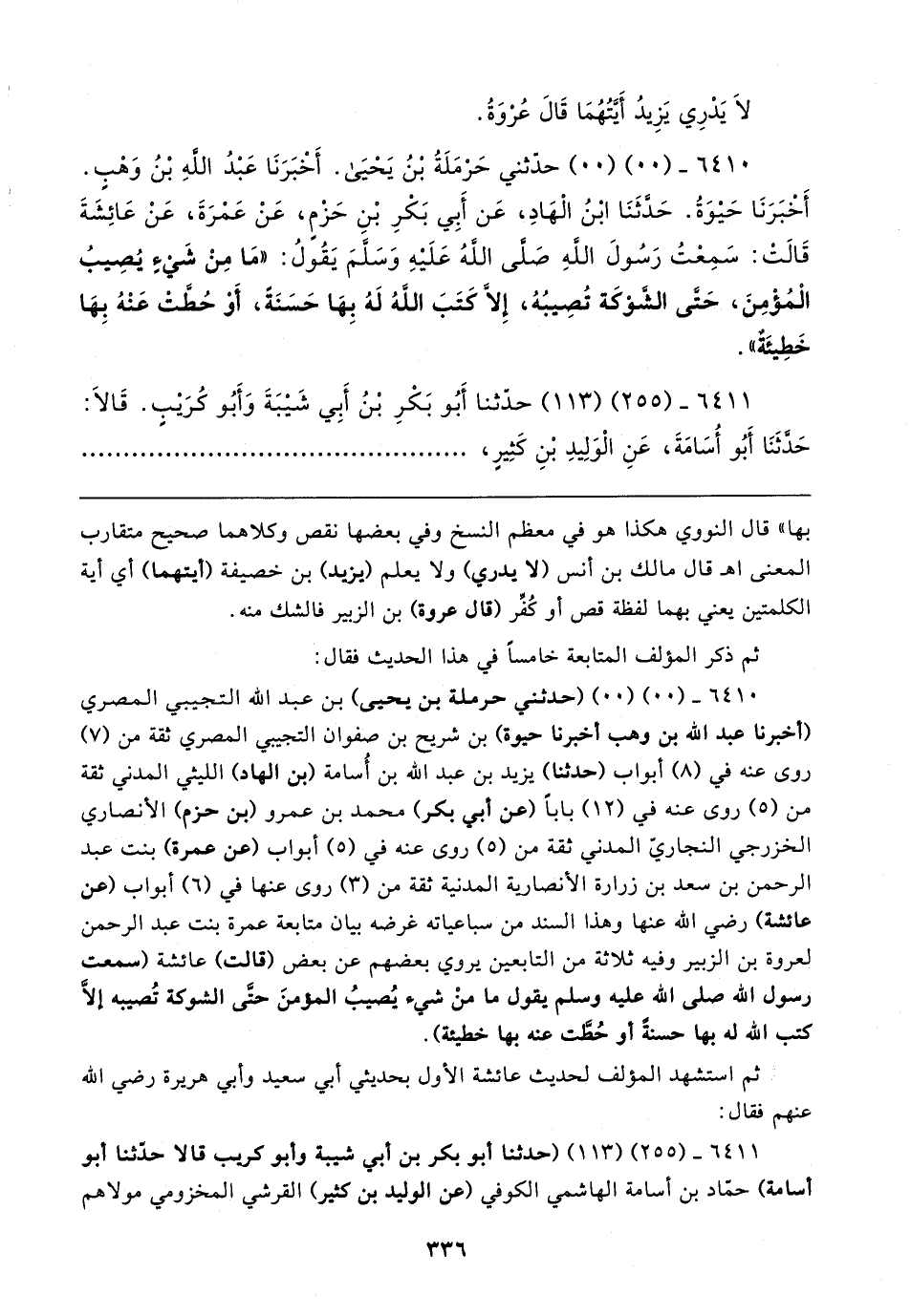 ٦٤١٠ - (٠٠) (٠٠) (حدثني حرملة بن يحيى) بن عبد الله التجيبي المصري (أخبرنا عبد الله بن وهب أخبرنا حيوة) بن شريح بن صفوان التجيبي المصري ثقة من (٧) روى عنه في (٨) أبواب (حدثنا) يزيد بن عبد الله بن أُسامة (بن الهاد) الليثي المدني ثقة من (٥) روى عنه في (١٢) بابا (عن أبي بكر) محمد بن عمرو (بن حزم) الأنصاري الخزرجي النجاريّ المدني ثقة من (٥) روى عنه في (٥) أبواب (عن عمرة) بنت عبد الرحمن بن سعد بن زرارة الأنصارية المدنية ثقة من (٣) روى عنها في (٦) أبواب (عن عائشة) رضي الله عنها وهذا السند من سباعياته غرضه بيان متابعة عمرة بنت عبد الرحمن لعروة بن الزبير وفيه ثلاثة من التابعين يروي بعضهم عن بعض (قالت) عائشة (سمعت رسول الله صلى الله عليه وسلم يقول ما منْ شيء يُصيبُ المؤمنَ حتَّى الشوكة تُصيبه إلَّا كتب الله له بها حسنةً أو حُطَّت عنه بها خطيئة).