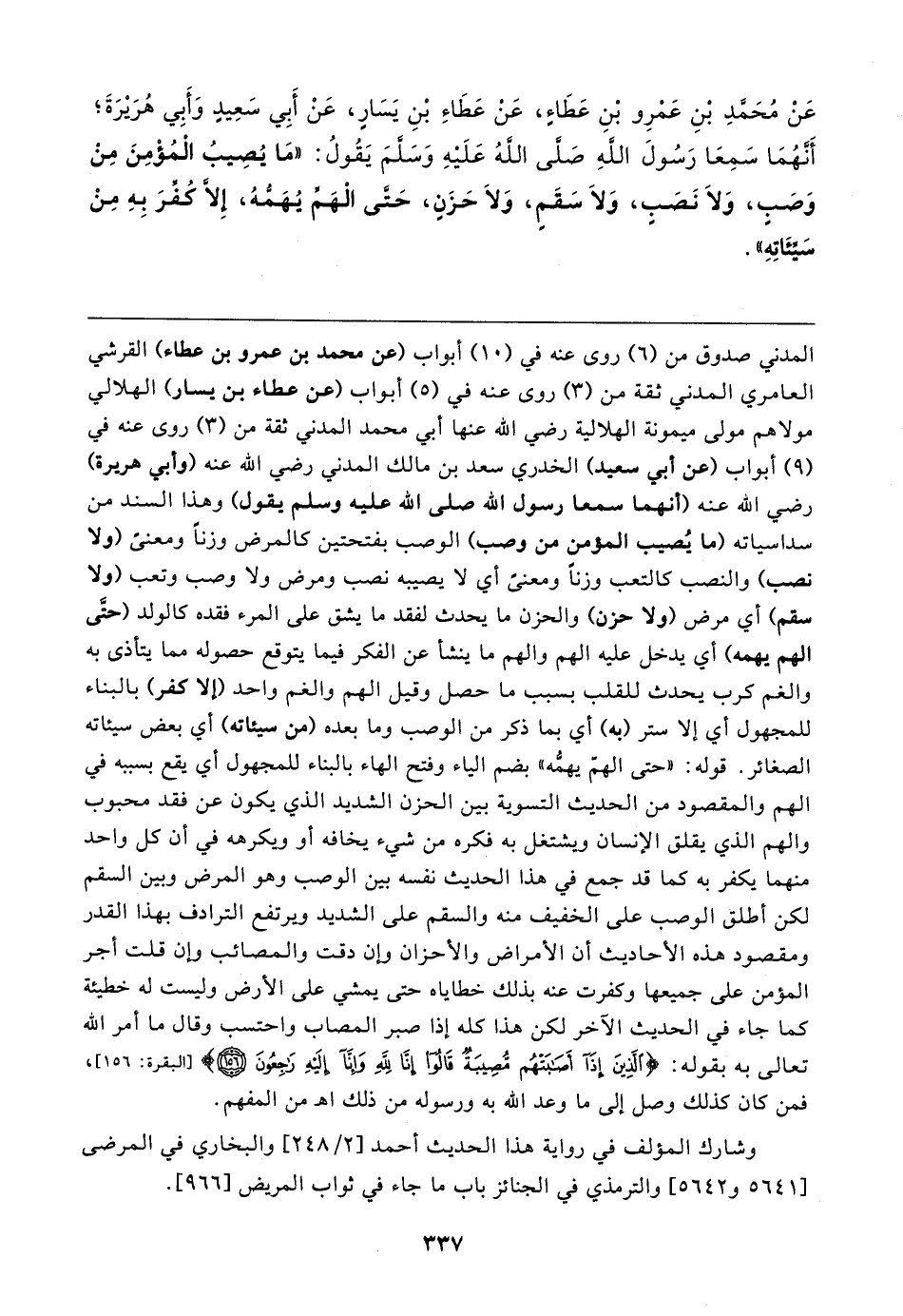 المدني صدوق من (٦) روى عنه في (١٥) أبواب (عن محمد بن عمرو بن عطاء) القرشي العامري المدني ثقة من (٣) روى عنه في (٥) أبواب (عن عطاء بن يسار) الهلالي مولاهم مولى ميمونة الهلالية رضي الله عنها أبي محمد المدني ثقة من (٣) روى عنه في (٩) أبواب (عن أبي سعيد) الخدري سعد بن مالك المدني رضي الله عنه (وأبي هريرة) رضي الله عنه (أنهما سمعا رسول الله صلى الله عليه وسلم يقول) وهذا السند من سداسياته (ما يُصيب المؤمن من وصب) الوصب بفتحتين كالمرض وزنًا ومعنىً (ولا نصب) والنصب كالتعب وزنًا ومعنىً أي لا يصيبه نصب ومرض ولا وصب وتعب (ولا سقم) أي مرض (ولا حزن) والحزن ما يحدث لفقد ما يشق على المرء فقده كالولد (حتَّى الهم يهمه) أي يدخل عليه الهم والهم ما ينشأ عن الفكر فيما يتوقع حصوله مما يتأذى به والغم كرب يحدث للقلب بسبب ما حصل وقيل الهم والغم واحد (إلا كفر) بالبناء للمجهول أي إلا ستر (به) أي بما ذكر من الوصب وما بعده (من سيئاته) أي بعض سيئاته الصغائر. قوله: "حتى الهمّ يهمُّه " بضم الياء وفتح الهاء بالبناء للمجهول أي يقع بسببه في الهم والمقصود من الحديث التسوية بين الحزن الشديد الذي يكون عن فقد محبوب والهم الذي يقلق الإنسان ويشتغل به فكره من شيء يخافه أو ويكرهه في أن كل واحد منهما يكفر به كما قد جمع في هذا الحديث نفسه بين الوصب وهو المرض وبين السقم لكن أطلق الوصب على الخفيف منه والسقم على الشديد ويرتفع الترادف بهذا القدر ومقصود هذه الأحاديث أن الأمراض والأحزان وإن دقت والمصائب وإن قلت أجر المؤمن على جميعها وكفرت عنه بذلك خطاياه حتى يمشي على الأرض وليست له خطيئة كما جاء في الحديث الآخر لكن هذا كله إذا صبر المصاب واحتسب وقال ما أمر الله تعالى به بقوله: {الَّذِينَ إِذَا أَصَابَتْهُمْ مُصِيبَةٌ قَالُوا إِنَّا لِلَّهِ وَإِنَّا إِلَيهِ رَاجِعُونَ (١٥٦)} [البقرة: ١٥٦]، فمن كان كذلك وصل إلى ما وعد الله به ورسوله من ذلك اهـ من المفهم.