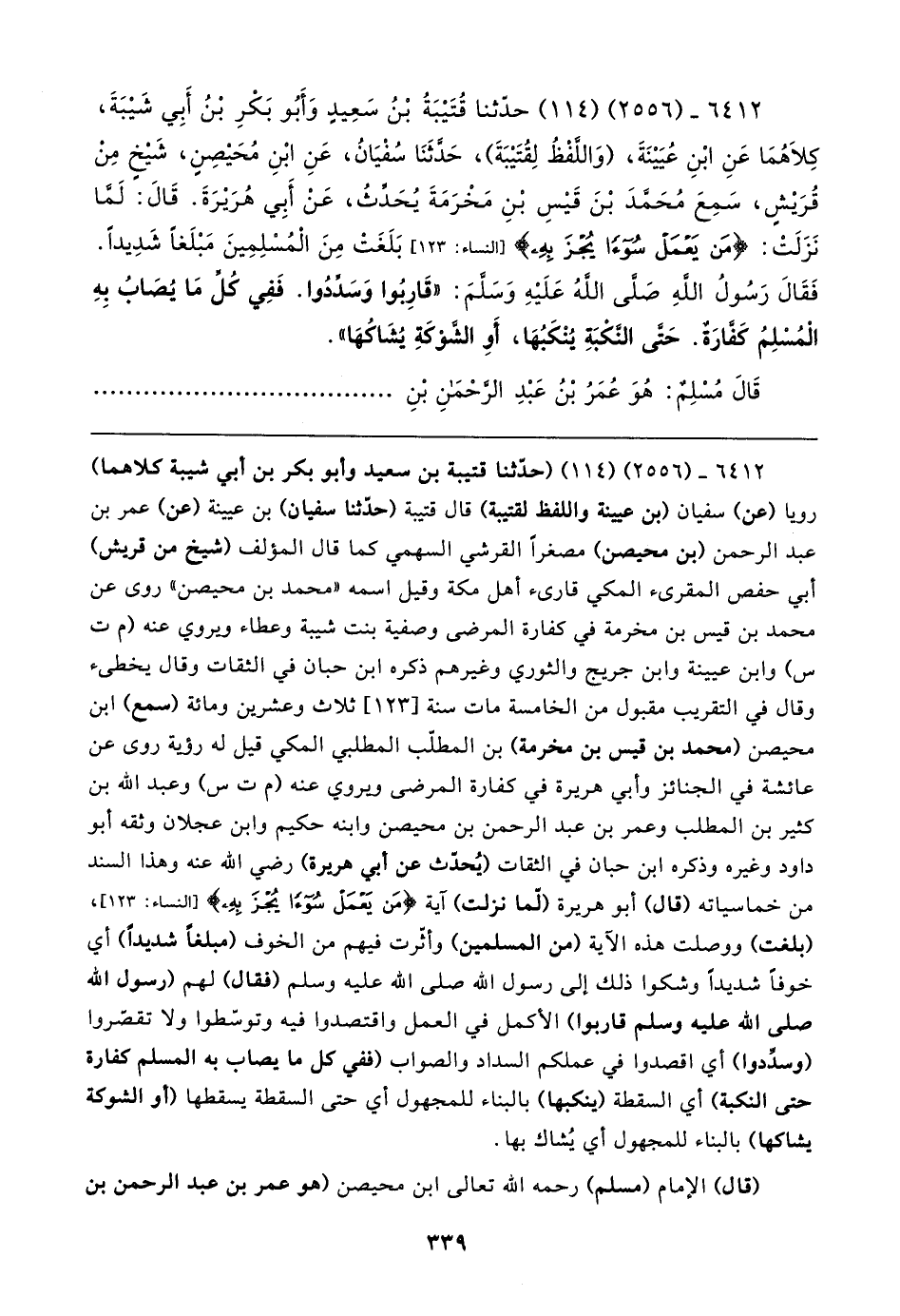 ٦٤١٢ - (٢٥٥٦) (١١٤) (حدَّثنا قتيبة بن سعيد وأبو بكر بن أبي شيبة كلاهما) رويا (عن) سفيان (بن عيينة واللفظ لقتيبة) قال قتيبة (حدَّثنا سفيان) بن عيينة (عن) عمر بن عبد الرحمن (بن محيصن) مصغرًا القرشي السهمي كما قال المؤلف (شيخ من قريش) أبي حفص المقرئ المكي قارئ أهل مكة وقيل اسمه "محمد بن محيصن" روى عن محمد بن قيس بن مخرمة في كفارة المرضى وصفية بنت شيبة وعطاء ويروي عنه (م ت س) وابن عيينة وابن جريج والثوري وغيرهم ذكره ابن حبان في الثقات وقال يخطئ وقال في التقريب مقبول من الخامسة مات سنة [١٢٣] ثلاث وعشرين ومائة (سمع) ابن محيصن (محمد بن قيس بن مخرمة) بن المطفب المطلبي المكي قيل له رؤية روى عن عائشة في الجنائز وأبي هريرة في كفارة المرضى ويروي عنه (م ت س) وعبد الله بن كثير بن المطلب وعمر بن عبد الرحمن بن محيصن وابنه حكيم وابن عجلان وثقه أبو داود وغيره وذكره ابن حبان في الثقات (يُحدّث عن أبي هريرة) رضي الله عنه وهذا السند من خماسياته (قال) أبو هريرة (لما نزلت) آية {مَنْ يَعْمَلْ سُوءًا يُجْزَ بِهِ} [النساء: ١٢٣]، (بلغت) ووصلت هذه الآية (من المسلمين) وأثّرت فيهم من الخوف (مبلغًا شديدًا) أي خوفًا شديدًا وشكوا ذلك إلى رسول الله صلى الله عليه وسلم (فقال) لهم (رسول الله صلى الله عليه وسلم قاربوا) الأكمل في العمل واقتصدوا فيه وتوسّطوا ولا تقصّروا (وسدِّدوا) أي اقصدوا في عملكم السداد والصواب (ففي كل ما يصاب به المسلم كفارة حتى النكبة) أي السقطة (ينكبها) بالبناء للمجهول أي حتى السقطة يسقطها (أو الشوكة يشاكها) بالبناء للمجهول أي يُشاك بها.