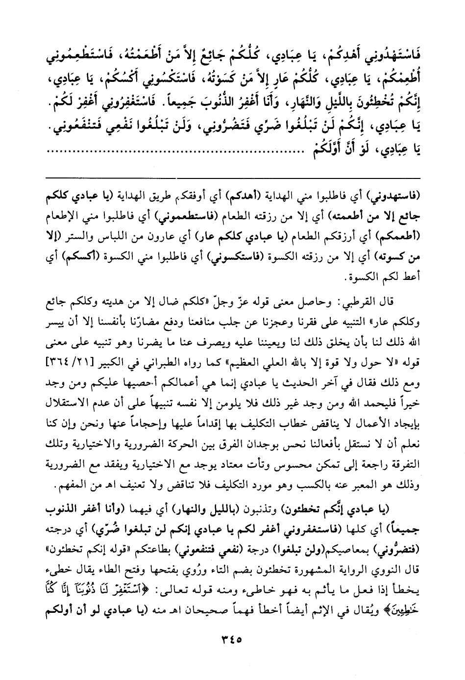 قال القرطبي: وحاصل معنى قوله عزّ وجلّ "كلكم ضال إلا من هديته وكلكم جائع وكلكم عار" التنبيه على فقرنا وعجزنا عن جلب منافعنا ودفع مضارّنا بأنفسنا إلا أن ييسر الله ذلك لنا بأن يخلق ذلك لنا ويعيننا عليه ويصرف عنا ما يضرنا وهو تنبيه على معنى قوله "لا حول ولا قوة إلا بالله العلي العظيم" كما رواه الطبراني في الكبير [٢١/ ٣٦٤] ومع ذلك فقال في آخر الحديث يا عبادي إنما هي أعمالكم أحصيها عليكم ومن وجد خيرًا فليحمد الله ومن وجد غير ذلك فلا يلومن إلا نفسه تنبيهًا على أن عدم الاستقلال بإيجاد الأعمال لا يناقض خطاب التكليف بها إقدامًا عليها وإحجامًا عنها ونحن وإن كنا نعلم أن لا نستقل بأفعالنا نحس بوجدان الفرق بين الحركة الضرورية والاختيارية وتلك التفرقة راجعة إلى تمكن محسوس وتأت معتاد يوجد مع الاختيارية ويفقد مع الضرورية وذلك هو المعبر عنه بالكسب وهو مورد التكليف فلا تناقض ولا تعنيف اهـ من المفهم.