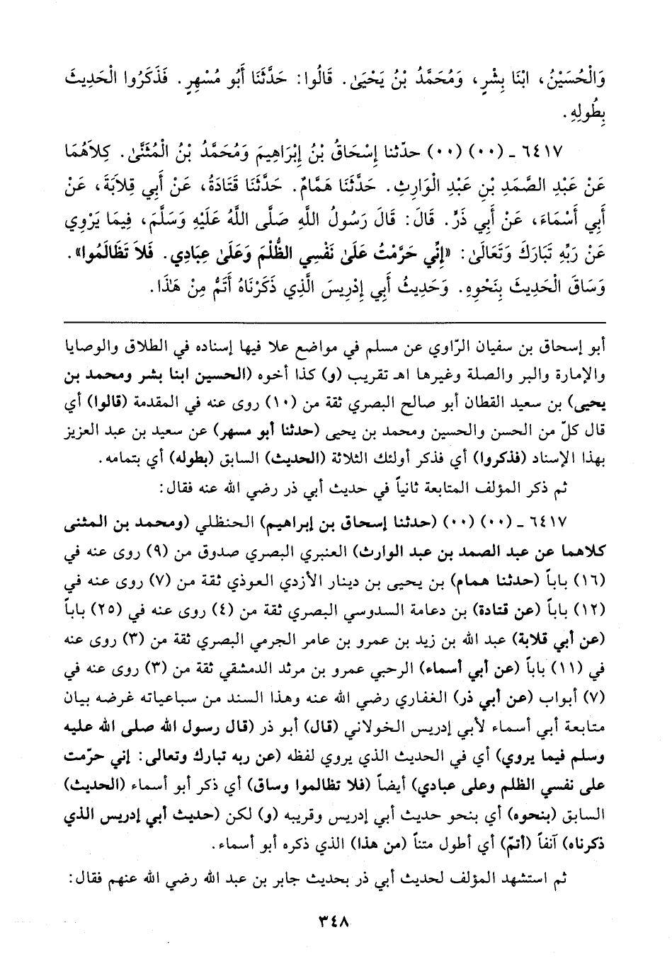 ٦٤١٧ - (٠٠) (٠٠) حدَّثنا إِسْحَاقُ بْنُ إِبْرَاهِيمَ وَمُحَمَّدُ بْنُ الْمُثَنَّى. كِلاهُمَا عَنْ عَبْدِ الصَّمَدِ بْنِ عَبْدِ الْوَارِثِ. حَدَّثَنَا هَمَّامٌ. حَدَّثَنَا قَتَادَةُ، عَنْ أَبِي قِلابَةَ، عَنْ أَبِي أَسْمَاءَ، عَنْ أَبِي ذَرٍّ. قَال: قَال رَسُولُ اللهِ صَلَّى اللهُ عَلَيهِ وَسَلَّمَ، فِيمَا يَرْوي عَنْ رَبِّهِ تَبَارَكَ وَتَعَالى: "إِنِّي حَرَّمْتُ عَلَى نَفْسِي الظُّلْمَ وَعَلَى عِبَادِي. فَلَا تَظَالمُوا". وَسَاقَ الْحَدِيثَ بِنَحْوهِ. وَحَدِيثُ أَبِي إِدْرِيس الَّذِي ذَكَرْنَاهُ أَتَمُّ مِنْ هَذَا