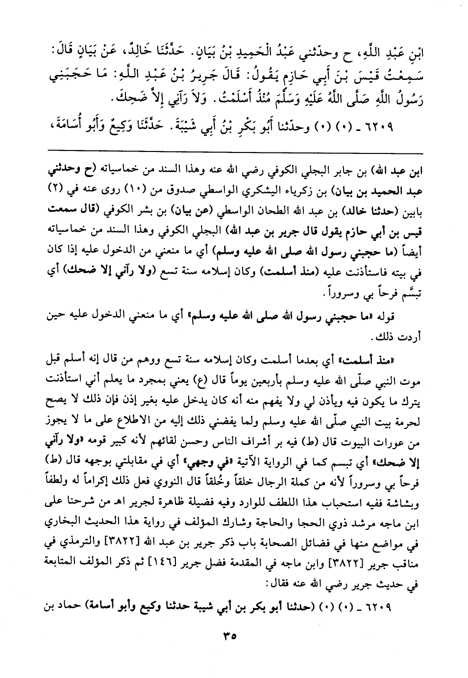 ابْنِ عَبْدِ اللهِ، ح وحدّثني عَبْدُ الْحَمِيدِ بْنُ بَيَانٍ. حَدَّثَنَا خَالِدٌ، عَنْ بَيَانٍ قَال: سَمِعْتُ قَيسَ بْنَ أَبِي حَازِمٍ يَقُولُ: قَال جَرِيرُ بْنُ عَبْدِ اللهِ: مَا حَجَبَنِي رَسُولُ اللهِ صَلَّى اللهُ عَلَيهِ وَسَلمَ مُنْذُ أَسْلَمْتُ. وَلَا رَآنِي إِلَّا ضَحِكَ.