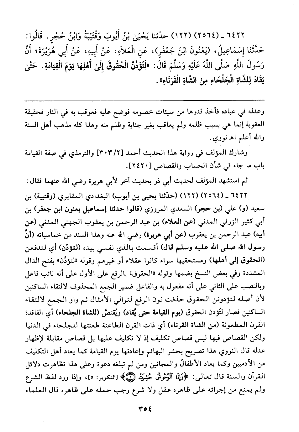٦٤٢٢ - (٢٥٦٤) (١٢٢) (حدَّثنا يحيى بن أيوب) البغدادي المقابري (وقتيبة) بن سعيد (و) علي (بن حجر) السعدي المروزي (قالوا حدثنا إسماعيل يعنون ابن جعفر) بن أبي كثير الزرقي المدني (عن العلاء) بن عبد الرحمن بن يعقوب الجهني المدني (عن أبيه) عبد الرحمن بن يعقوب (عن أبي هريرة) رضي الله عنه وهذا السند من خماسياته (أن رسول الله صلى الله عليه وسلم قال) أقسمت بالذي نفسي بيده (لتؤدّن) أي لتدفعن (الحقوق إلى أهلها) ومستحقيها سواء كانوا عقلاء أو غيرهم وقوله "لتؤدَّن" بفتح الدال المشددة وفي بعض النسخ بضمها وقوله "الحقوق" بالرفع على الأول على أنه نائب فاعل وبالنصب على الثاني على أنه مفعول به والفاعل ضمير الجمع المحذوف لالتقاء الساكنين لأن أصله لتؤدونن الحقوق حذفت نون الرفع لتوالي الأمثال ثم واو الجمع لالتقاء الساكنين فصار لتُؤدن الحقوق (يوم القيامة حتى يُقاد) ويُقتصَّ (للشاة الجلحاء) أي الفاقدة القرن المطعونة (من الشاة القرناء) أي ذات القرن الطاعنة طعنتها للجلحاء في الدنيا ولكن القصاص فيها ليس قصاص تكليف إذ لا تكليف عليها بل قصاص مقابلة لإظهار عدله قال النووي هذا تصريح بحشر البهائم وإعادتها يوم القيامة كما يعاد أهل التكليف من الآدميين وكما يعاد الأطفالُ والمجانين ومن لم تبلغه دعوة وعلى هذا تظاهرت دلائل القرآن والسنة قال تعالى: {وَإِذَا الْوُحُوشُ حُشِرَتْ (٥)} [التكوير: ٥]، وإذا ورد لفظ الشرع ولم يمنع من إجرائه على ظاهره عقل ولا شرع وجب حمله على ظاهره قال العلماء
