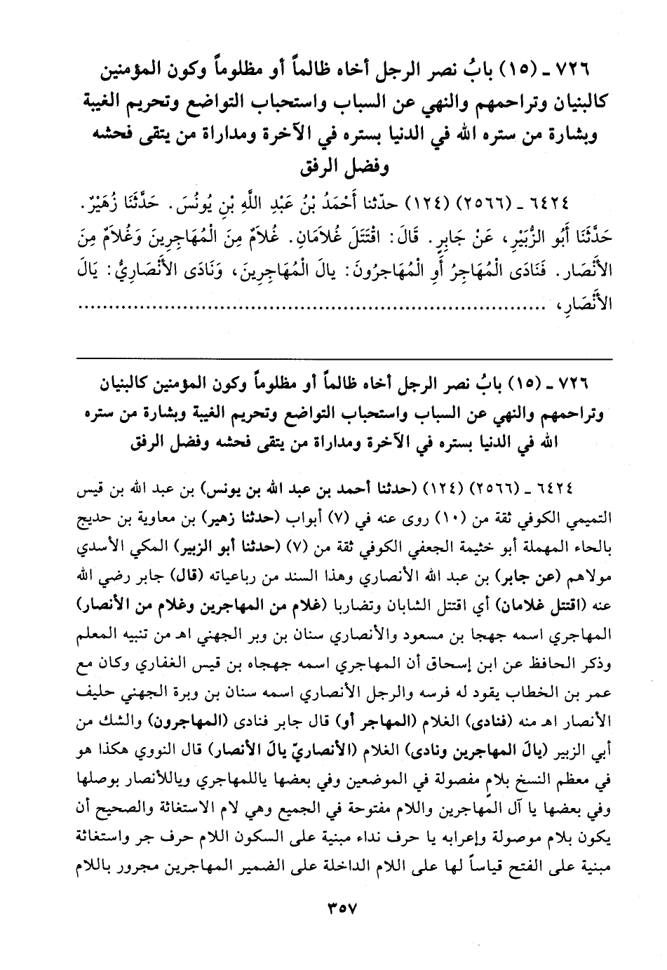 ٧٢٦ - (١٥) بابُ نصر الرجل أخاه ظالمًا أو مظلومًا وكون المؤمنين كالبنيان وتراحمهم والنهي عن السباب واستحباب التواضع وتحريم الغيبة وبشارة من ستره الله في الدنيا بستره في الآخرة ومداراة من يتقى فحشه وفضل الرفق