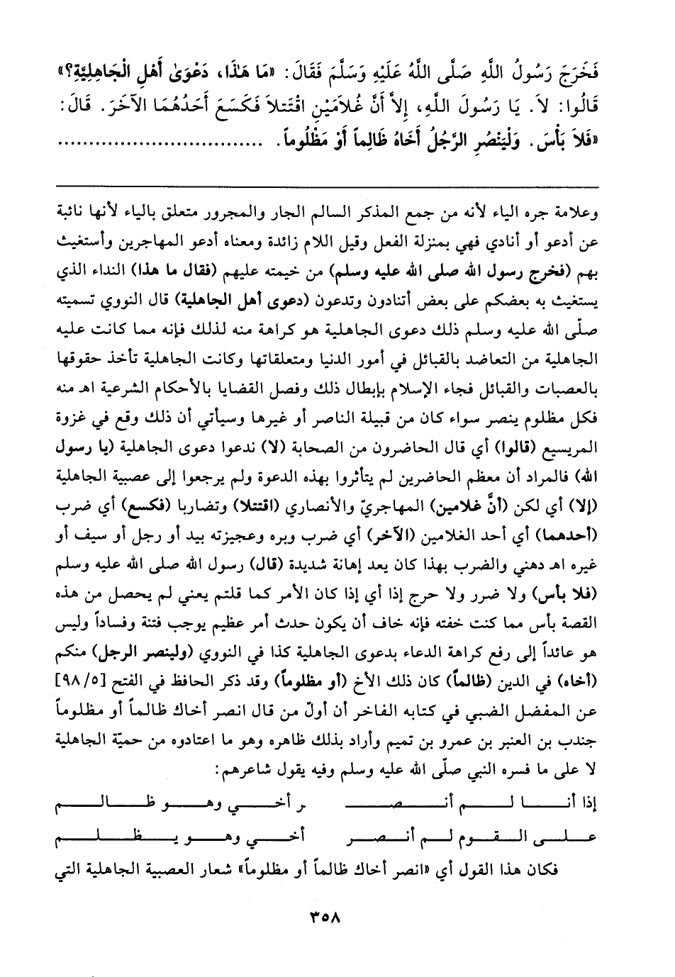 فَخَرَجَ رَسُولُ اللهِ صَلَّى اللهُ عَلَيهِ وَسَلَّمَ فَقَال: "مَا هَذَا، دَعوَى أَهْلِ الْجَاهِلِيَّةِ؟ " قَالُوا: لَا. يَا رَسُولَ اللهِ، إلا أَنَّ غُلامَينِ اقْتَتلا فَكَسَعَ أَحَدُهُمَا الآخَرَ. قَال: "فَلَا بَأْسَ. وَلْيَنْصُرِ الرَّجُلُ أَخَاهُ ظَالِمًا أَوْ مَظْلُومًا