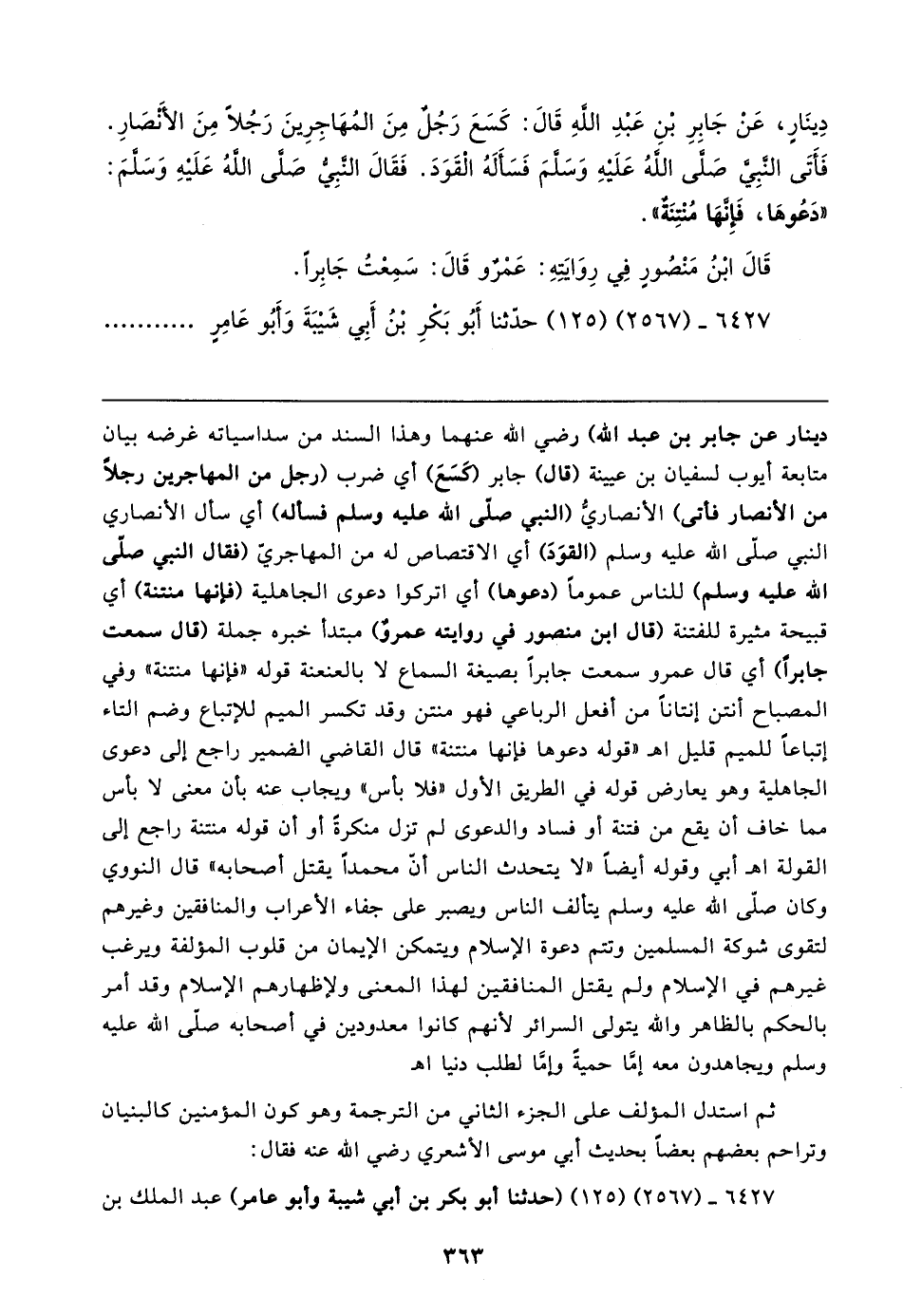 دِينَارٍ، عَنْ جَابِرِ بْنِ عَبْدِ اللهِ قَال: كَسَعَ رَجُلٌ مِنَ المُهَاجِرِينَ رَجُلًا مِنَ الأَنْصَارِ. فَأَتَى النَّبِيَّ صَلَّى اللهُ عَلَيهِ وَسَلَّمَ فَسَأَلَهُ الْقَوَدَ. فَقَال النَّبِيُّ صَلَّى اللهُ عَلَيهِ وَسَلَّمَ: "دَعُوهَا، فَإِنَّهَا مُنْتِنَةٌ".
