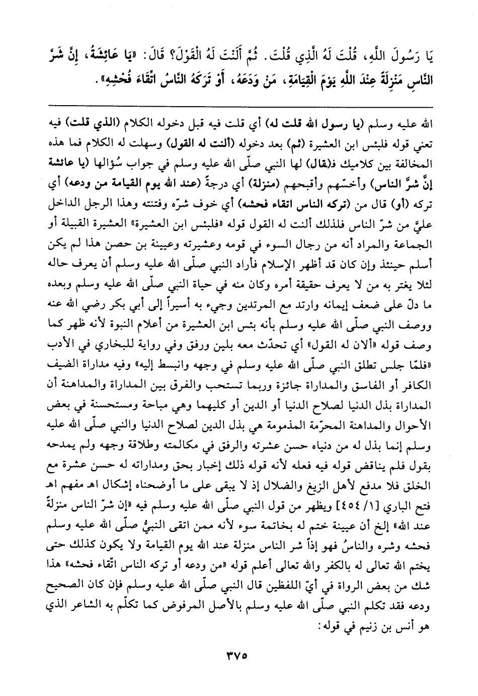الله عليه وسلم (يا رسول الله قلت له) أي قلت فيه قبل دخوله الكلام (الذي قلت) فيه تعني قوله فلبئس ابن العشيرة (ثم) بعد دخوله (ألنت له القول) وسهلت له الكلام فما هذه المخالفة بين كلاميك فـ (ـقال) لها النبي صلى الله عليه وسلم في جواب سُؤالها (يا عائشة إنَّ شرَّ الناس) وأخسّهم وأقبحهم (منزلة) أي درجةً (عند الله يوم القيامة من ودعه) أي تركه (أو) قال من (تركه الناس اتقاء فحشه) أي خوف شرّه وفتنته وهذا الرجل الداخل عليَّ من شرّ الناس فلذلك ألنت له القول قوله "فلبئس ابن العشيرة" العشيرة القبيلة أو الجماعة والمراد أنه من رجال السوء في قومه وعشيرته وعيينة بن حصن هذا لم يكن أسلم حينئذ وإن كان قد أظهر الإسلام فأراد النبي صلى الله عليه وسلم أن يعرف حاله لئلا يغتر به من لا يعرف حقيقة أمره وكان منه في حياة النبي صلى الله عليه وسلم وبعده ما دل على ضعف إيمانه وارتد مع المرتدين وجيء به أسيرًا إلى أبي بكر رضي الله عنه ووصف النبي صلى الله عليه وسلم بأنه بئس ابن العشيرة من أعلام النبوة لأنه ظهر كما وصف قوله "ألان له القول" أي تحدّث معه بلين ورفق وفي رواية للبخاري في الأدب "فلمَّا جلس تطلق النبي صلى الله عليه وسلم في وجهه وانبسط إليه" وفيه مداراة الضيف الكافر أو الفاسق والمداراة جائزة وربما تستحب والفرق بين المداراة والمداهنة أن المداراة بذل الدنيا لصلاح الدنيا أو الدين أو كليهما وهي مباحة ومستحسنة في بعض الأحوال والمداهنة المحرّمة المذمومة هي بذل الدين لصلاح الدنيا والنبي صلى الله عليه وسلم إنما بذل له من دنياه حسن عشرته والرفق في مكالمته وطلاقة وجهه ولم يمدحه بقول فلم يناقض قوله فيه فعله لأنه قوله ذلك إخبار بحق ومداراته له حسن عشرة مع الخلق فلا مدفع لأهل الزيغ والضلال إذ لا يبقى على ما أوضحناه إشكال اهـ مفهم اهـ فتح الباري [١/ ٤٥٤] ويظهر من قول النبي صلى الله عليه وسلم فيه "إن شرّ الناس منزلةً عند الله" إلخ أن عيينة ختم له بخاتمة سوء لأنه ممن اتقى النبيُّ صلى الله عليه وسلم فحشه وشره والناسُ فهو إذًا شر الناس منزلة عند الله يوم القيامة ولا يكون كذلك حتى يختم الله تعالى له بالكفر والله تعالى أعلم قوله "من ودعه أو تركه الناس اتّقاء فحشه" هذا شك من بعض الرواة في أيّ اللفظين قال النبي صلى الله عليه وسلم فإن كان الصحيح ودعه فقد تكلم النبي صلى الله عليه وسلم بالأصل المرفوض كما تكلّم به الشاعر الذي هو أنس بن زنيم في قوله: