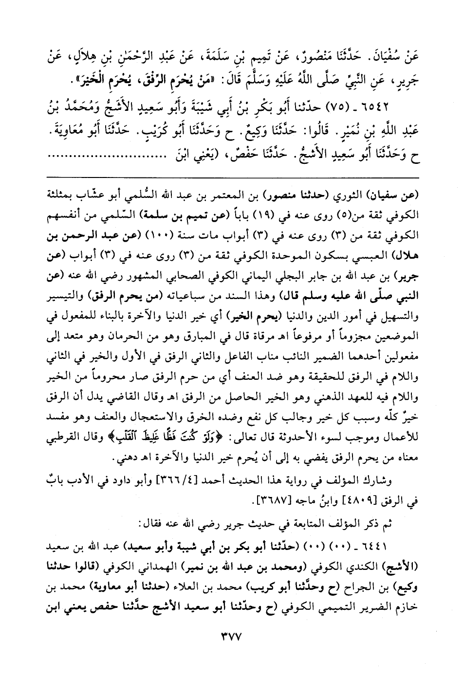 عَنْ سُفْيَانَ. حَدَّثَنَا مَنْصُورٌ، عَنْ تَمِيمِ بْنِ سَلَمَةَ، عَنْ عَبْدِ الرَّحْمَنِ بْنِ هِلالٍ، عَنْ جَرِيرٍ، عَنِ النَّبِيِّ صَلَّى الله عَلَيهِ وَسَلَّمَ قَال: "مَنْ يُحْرَمِ الرِّفْقَ، يُحْرَمِ الْخَيرَ".