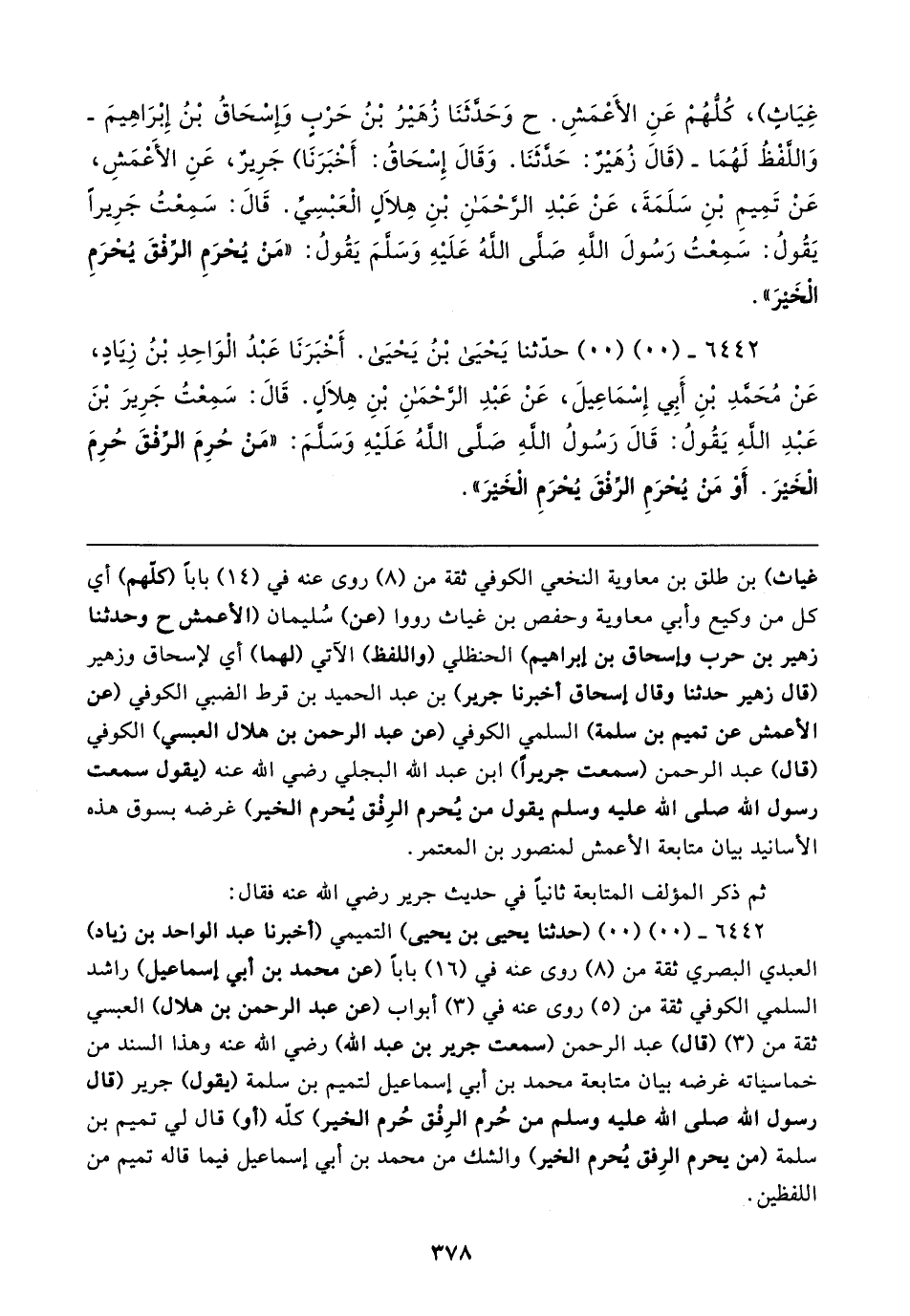 غِيَاثٍ)، كُلُّهُمْ عَنِ الأَعْمَشِ. ح وَحَدَّثَنَا زُهَيرُ بْنُ حَرْبٍ وَإِسْحَاقُ بْنُ إِبْرَاهِيمَ -وَاللَّفْظُ لَهُمَا- (قَال زُهَيرٌ: حَدَّثَنَا. وَقَال إِسْحَاقُ: أَخْبَرَنَا) جَرِيرٌ، عَنِ الأَعْمَشِ، عَنْ تَمِيمِ بْنِ سَلَمَةَ، عَنْ عَبْدِ الرَّحْمَنِ بْنِ هِلالٍ الْعَبْسِيِّ. قَال: سَمِعْتُ جَرِيرًا يَقُولُ: سَمِعْتُ رَسُولَ اللهِ صَلَّى اللهُ عَلَيهِ وَسَلَّمَ يَقُولُ: "مَنْ يُحْرَمِ الرِّفْقَ يُحْرَمِ الْخَيرَ".