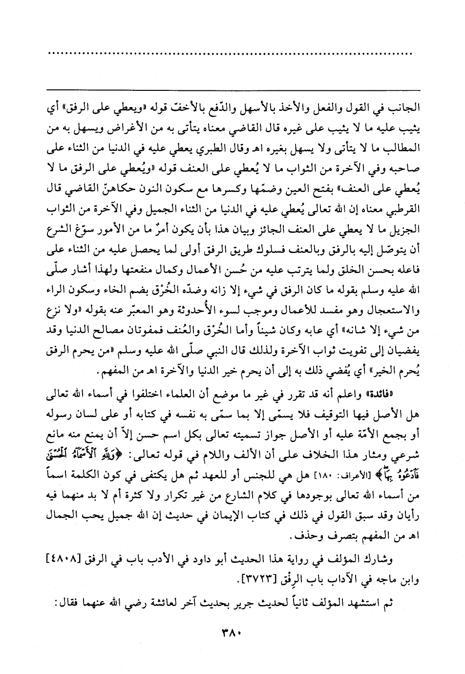 "فائدة" واعلم أنه قد تقرر في غير ما موضع أن العلماء اختلفوا في أسماء الله تعالى هل الأصل فيها التوقيف فلا يسمّى إلا بما سمّى به نفسه في كتابه أو على لسان رسوله أو بجمع الأمّة عليه أو الأصل جواز تسميته تعالى بكل اسم حسن إلّا أن يمنع منه مانع شرعي ومثار هذا الخلاف على أن الألف واللام في قوله تعالى: {وَلِلَّهِ الْأَسْمَاءُ الْحُسْنَى فَادْعُوهُ بِهَا} [الأعراف: ١٨٠] هل هي للجنس أو للعهد ثم هل يكتفى في كون الكلمة اسمًا من أسماء الله تعالى بوجودها في كلام الشارع من غير تكرار ولا كثرة أم لا بد منهما فيه رأيان وقد سبق القول في ذلك في كتاب الإيمان في حديث إن الله جميل يحب الجمال اهـ من المفهم بتصرف وحذف.