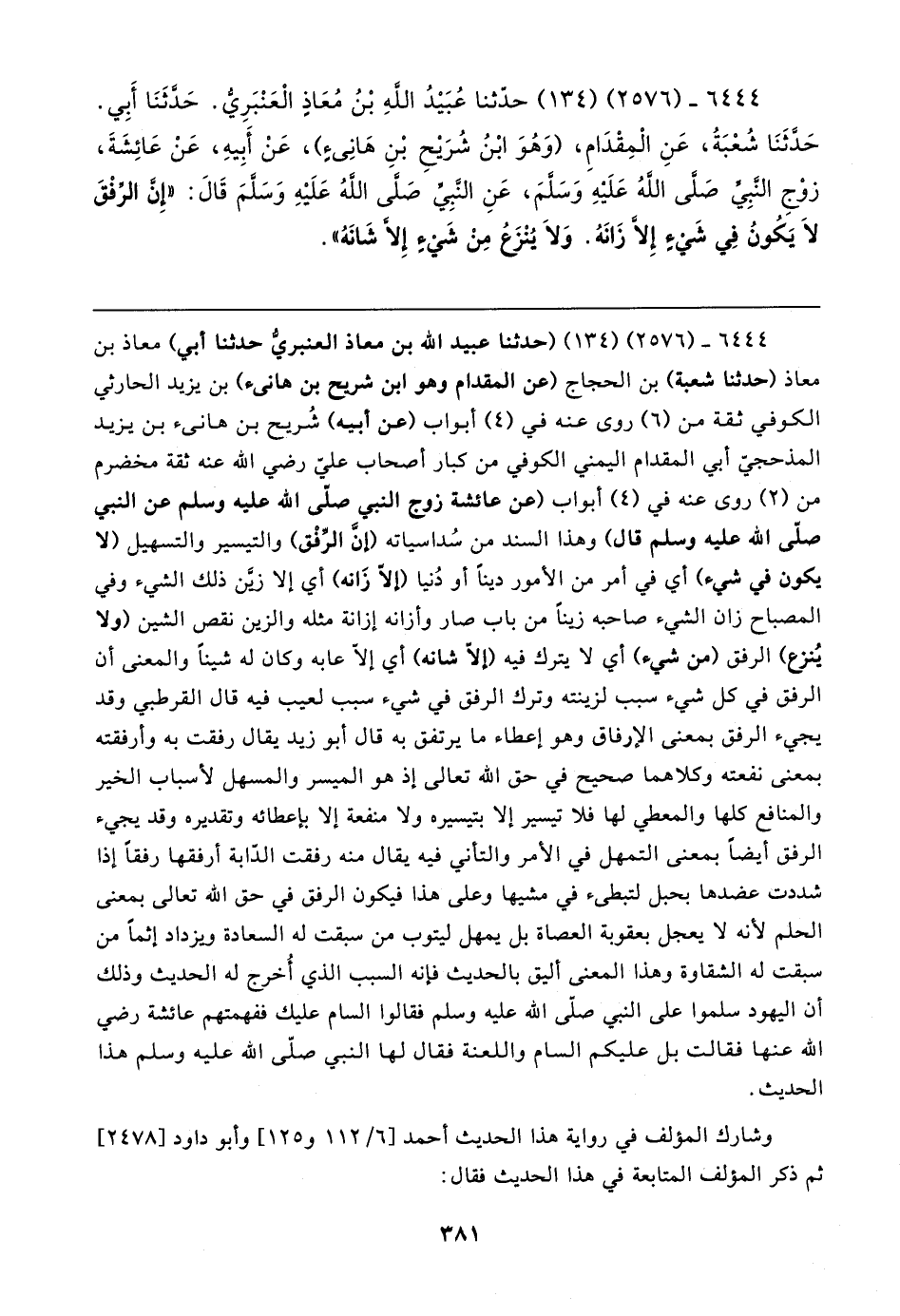 ٦٤٤٤ - (٢٥٧٦) (١٣٤) حدَّثنا عُبَيدُ اللهِ بْنُ مُعَاذٍ الْعَنْبَرِيُّ. حَدَّثَنَا أَبِي. حَدَّثَنَا شُعْبَةُ، عَنِ الْمِقْدَامِ، (وَهُوَ ابْنُ شُرَيحِ بْنِ هَانِئٍ)، عَنْ أَبِيهِ، عَنْ عَائِشَةَ، زوْجِ النَّبِيِّ صَلَّى اللهُ عَلَيهِ وَسَلَّمَ، عَنِ النَّبِيِّ صَلَّى اللهُ عَلَيهِ وَسَلَّمَ قَال: "إِنَّ الرِّفْقَ لَا يَكُونُ فِي شَيءٍ إلا زَانَهُ. وَلَا يُنْزَعُ مِنْ شَيءٍ إلا شَانَهُ"