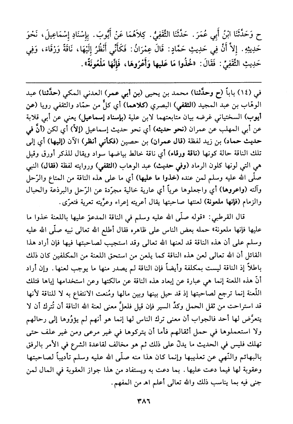 في (١٤) بابًا (ح وحدَّثنا) محمد بن يحيى (بن أبي عمر) العدني المكي (حدَّثنا) عبد الوهَّاب بن عبد المجيد (الثقفي) البصري (كلاهما) أي كلٌّ من حمّاد والثقفي رويا (عن أيوب) السختياني غرضه بيان متابعتهما لابن علية (بإسناد إسماعيل) يعني عن أبي قلابة عن أبي المهلب عن عمران (نحو حديثه) أي نحو حديث إسماعيل (إلّا) أي لكن (أن في حديث حماد) بن زيد لفظة (قال عمران) بن حصين (فكاني أنظر) الآن (إليها) أي إلى تلك الناقة حالة كونها (ناقة ورقاء) أي ناقة خالط بياضها سواد ويقال للذكر أورق وقيل هي التي لونها كلون الرماد (وفي حديث) عبد الوهاب (الثقفي) وروايته لفظة (فقال) النبي صلى الله عليه وسلم لمن عنده (خذوا ما عليها) أي ما على هذه الناقة من المتاع والرّحل وآلته (واعروها) أي واجعلوها عريًا أي عارية خالية مجرّدة عن الرّحل والبرذعة والحبال والزمام (فإنها ملعونة) لعنتها صاحبتها يقال أعريته إعراء وعرَّيته تعرية فتعرّى.