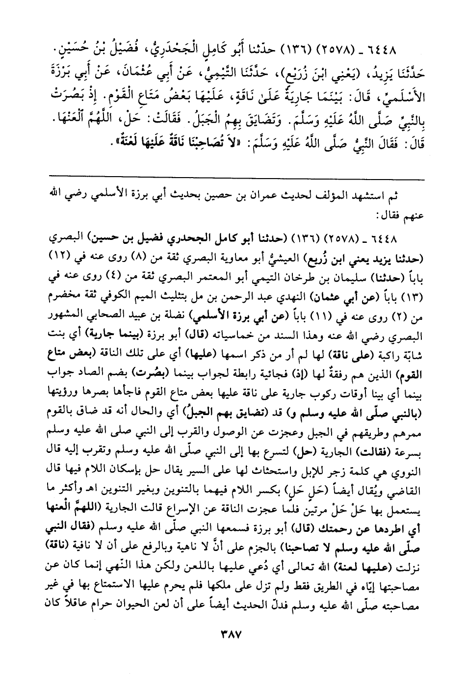 ٦٤٤٨ - (٢٥٧٨) (١٣٦) (حدثنا أبو كامل الجحدري فضيل بن حسين) البصري (حدثنا يزيد يعني ابن زُريع) العيشيُّ أبو معاوية البصري ثقة من (٨) روى عنه في (١٢) بابا (حدثنا) سليمان بن طرخان التيمي أبوالمعتمر البصري ثقة من (٤) روى عنه في (١٣) بابا (عن أبي عثمان) النهدي عبد الرحمن بن مل بتثليث الميم الكوفي ثقة مخضرم من (٢) روى عنه في (١١) بابا (عن أبي برزة الأسلمي) نضلة بن عبيد الصحابي المشهور البصري رضي الله عنه وهذا السند من خماسياته (قال) أبو برزة (بينما جارية) أي بنت شابّة راكبة (على ناقة) لها لم أر من ذكر اسمها (عليها) أي على تلك الناقة (بعض متاع القوم) الذين هم رفقةٌ لها (إذ) فجائية رابطة لجواب بينما (بصُرت) بضم الصاد جواب بينما أي بينا أوقات ركوب جارية على ناقة عليها بعض متاع القوم فاجأها بصرها ورؤيتها (بالنبي صلى الله عليه وسلم و) قد (تضايق بهم الجبلُ) أي والحال أنه قد ضاق بالقوم ممرهم وطريقهم في الجبل وعجزت عن الوصول والقرب إلى النبي صلى الله عليه وسلم بسرعة (فقالت) الجارية (حل) لتسرع بها إلى النبي صلى الله عليه وسلم وتقرب إليه قال النووي هي كلمة زجر للإبل واستحثاث لها على السير يقاله حل بإسكان اللام فيها قال القاضي ويُقال أيضًا (حَلٍ حَلٍ) بكسر اللام فيهما بالتنوين وبغير التنوين اهـ وأكثر ما يستعمل بها حَلْ حَلْ مرتين فلما عجزت الناقة عن الإسراع قالت الجارية (اللهمَّ الْعنها أي اطردها عن رحمتك (قال) أبو برزة فسمعها النبي صلى الله عليه وسلم (فقال النبي صلى الله عليه وسلم لا تصاحبنا) بالجزم على أن لا ناهية وبالرفع على أن لا نافية (ناقة) نزلت (عليها لعنة) الله تعالى أي دُعي عليها باللعن ولكن هذا النَّهي إنما كان عن مصاحبتها إيّاه في الطريق فقط ولم تزل على ملكها فلم يحرم عليها الاستمتاع بها في غير مصاحبته صلى الله عليه وسلم فدلّ الحديث أيضًا على أن لعن الحيوان حرام عاقلًا كان