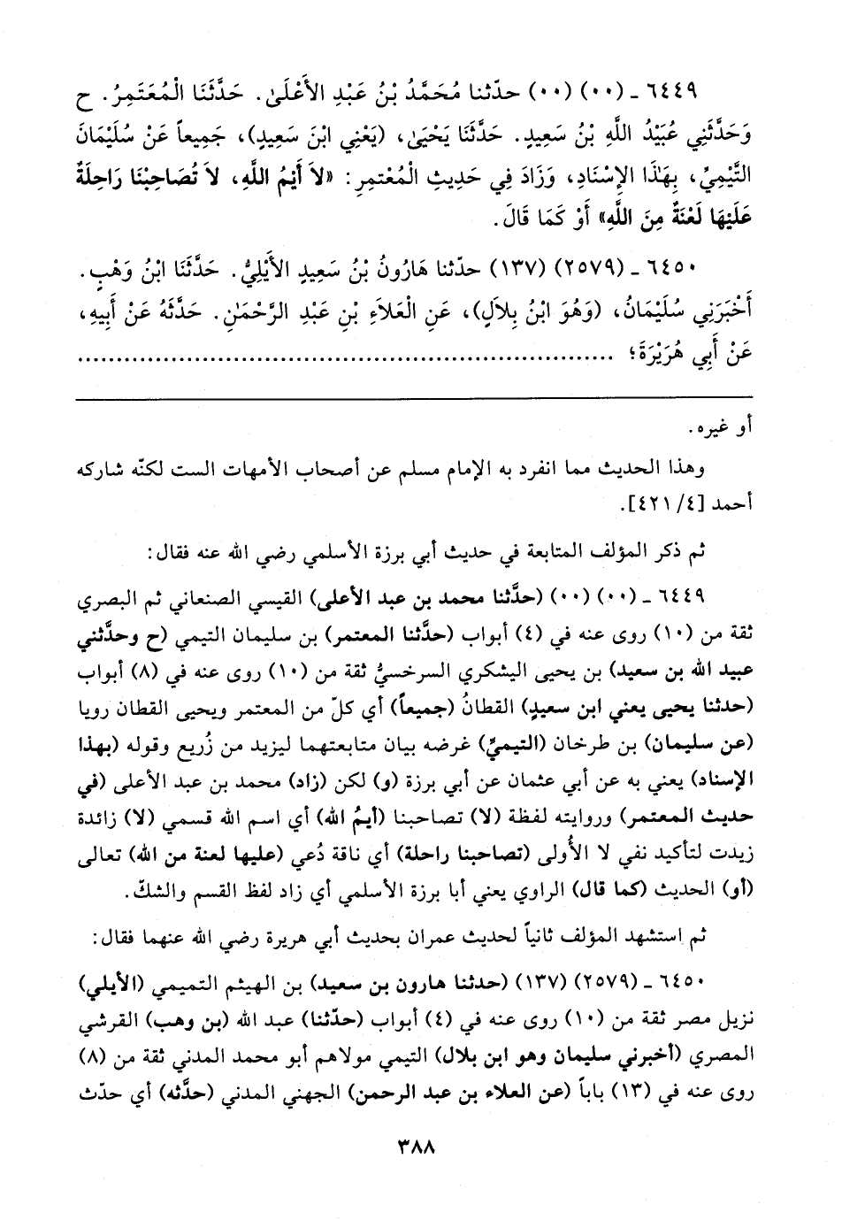 ٦٤٤٩ - (٠٠) (٠٠) (حدَّثنا محمد بن عبد الأعلى) القيسي الصنعاني ثم البصري ثقة من (١٠) روى عنه في (٤) أبواب (حدَّثنا المعتمر) بن سليمان التيمي (ح وحدَّثني عبيد الله بن سعيد) بن يحيى اليشكري السرخسيُّ ثقة من (١٠) روى عنه في (٨) أبواب (حدثنا يحيى يعني ابن سعيدٍ) القطانُ (جميعًا) أي كلّ من المعتمر ويحيى القطان رويا (عن سليمان) بن طرخان (التيميِّ) غرضه بيان متابعتهما ليزيد من زُريع وقوله (بهذا الإسناد) يعني به عن أبي عثمان عن أبي برزة (و) لكن (زاد) محمد بن عبد الأعلى (في حديث المعتمر) وروايته لفظة (لا) تصاحبنا (أيمُ الله) أي اسم الله قسمي (لا) زائدة زيدت لتأكيد نفي لا الأولى (تصاحبنا راحلة) أي ناقة دُعي (عليها لعنة من الله) تعالى (أو) الحديث (كما قال) الراوي يعني أبا برزة الأسلمي أي زاد لفظ القسم والشكّ.