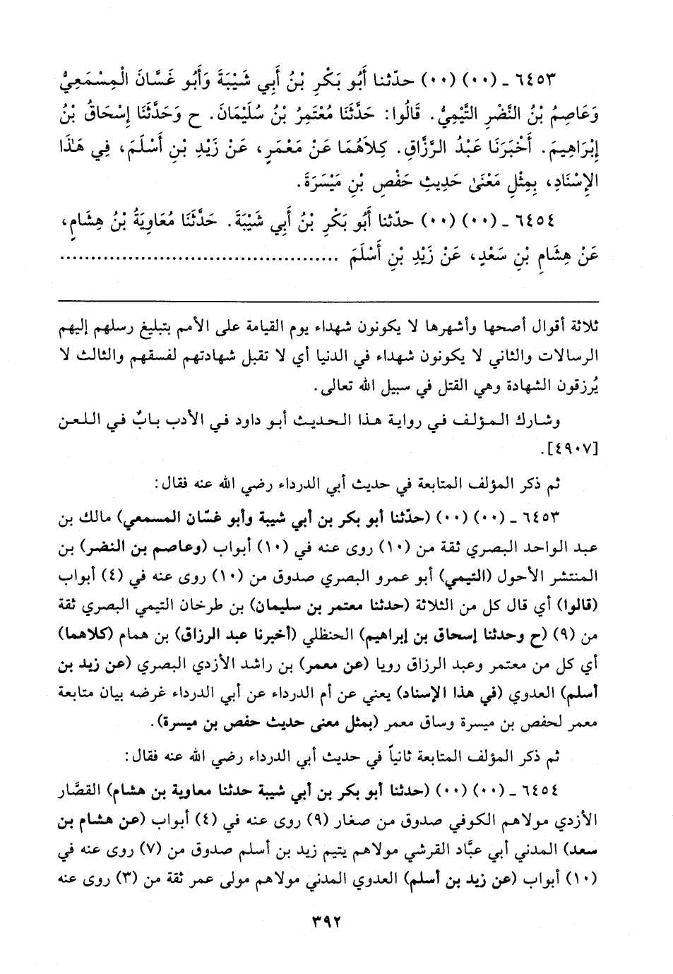 ٦٤٥٣ - (٠٠) (٠٠) (حدَّثنا أبو بكر بن أبي شيبة وأبو غسّان المسمعي) مالك بن عبد الواحد البصري ثقة من (١٠) روى عنه في (١٠) أبواب (وعاصم بن النضر) بن المنتشر الأحول (التيمي) أبو عمرو البصري صدوق من (١٠) روى عنه في (٤) أبواب (قالوا) أي قال كل من الثلاثة (حدثنا معتمر بن سليمان) بن طرخان التيمي البصري ثقة من (٩) (ح وحدثنا إسحاق بن إبراهيم) الحنظلي (أخبرنا عبد الرزاق) بن همام (كلاهما) أي كل من معتمر وعبد الرزاق رويا (عن معمر) بن راشد الأزدي البصري (عن زيد بن أسلم) العدوي (في هذا الإسناد) يعني عن أم الدرداء عن أبي الدرداء غرضه بيان متابعة معمر لحفص بن ميسرة وساق معمر (بمثل معنى حديث حفص بن ميسرة).