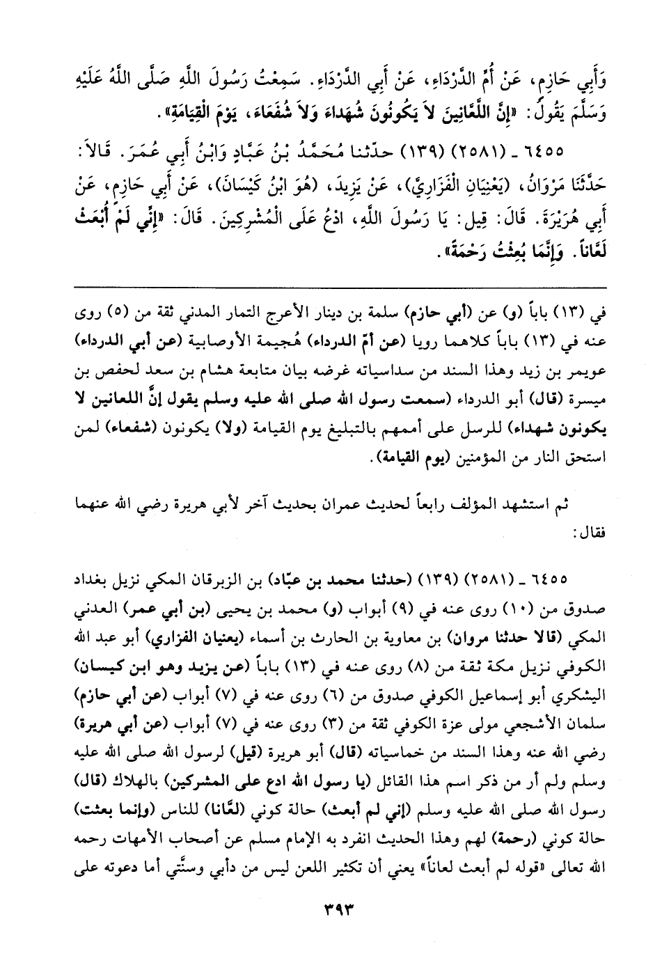 وَأَبِي حَازِمٍ، عَنْ أُمِّ الدَّرْدَاءِ، عَنْ أَبِي الدَّرْدَاءِ. سَمِعْتُ رَسُولَ الله صَلَّى اللهُ عَلَيهِ وَسَلَّمَ يَقُولُ: "إِنَّ اللَّعَّانِينَ لَا يَكُونُونَ شُهَداءَ وَلَا شُفَعَاءَ، يَوْمَ الْقِيَامَةِ".