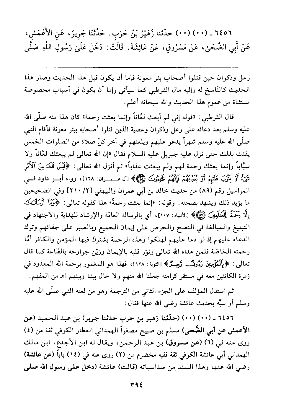 رعل وذكوان حين قتلوا أصحاب بئر معونة فإما أن يكون قبل هذا الحديث وصار هذا الحديث كالنَّاسخ له وإليه مال القرطبي كما سيأتي وإما أن يكون في أسباب مخصوصة مستثناة من عموم هذا الحديث والله سبحانه أعلم.