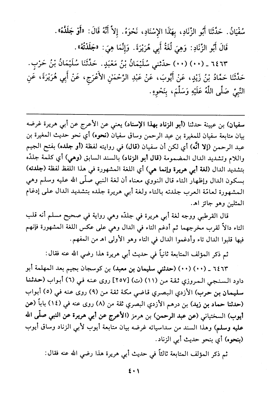 سفيان) بن عيينة حدثنا (أبو الزناد بهذا الإسناد) يعني عن الأعرج عن أبي هريرة غرضه بيان متابعة سفيان للمغيرة بن عبد الرحمن وساق سفيان (نحوه) أي نحو حديث المغيرة بن عبد الرحمن (إلا أنَّه) أي لكن أن سفيان (قال) في روايته لفظة (أو جلده) بفتح الجيم واللام وتشديد الدال المضمومة (قال أبو الزناد) بالسند السابق (وهي) أي كلمة جلدّه بتشديد الدال (لغة أبي هريرة وإنما هي) أي اللغة المشهورة في هذا اللفظ لفظة (جلدته) بسكون الدال وإظهار التاء قال النووي معناه أن لغة النبي صلى الله عليه وسلم وهي المشهورة لعامّة العرب جلدته بالتاء ولغة أبي هريرة جلده بتشديد الدال على إدغام المثلين وهو جائز اهـ.