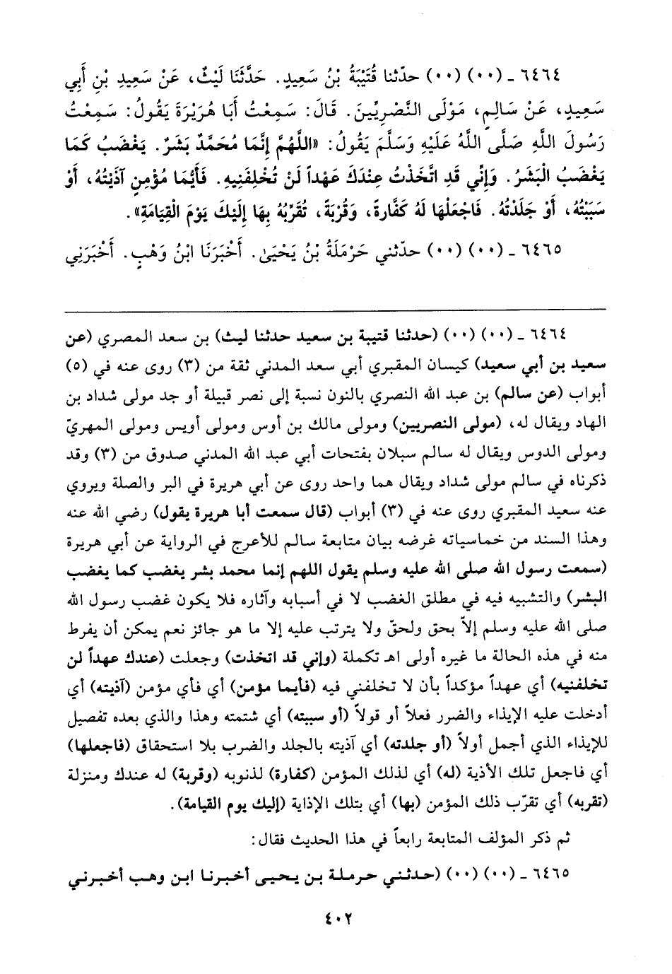 ٦٤٦٤ - (٠٠) (٠٠) حدَّثنا قُتَيبَةُ بْنُ سَعِيدٍ. حَدَّثَنَا لَيثٌ، عَنْ سَعِيدٍ بْنِ أَبِي سَعِيدٍ، عَنْ سَالِمٍ، مَوْلَى النَّصْرِيِّينَ. قَال: سَمِعْتُ أَبَا هُرَيرَةَ يَقُولُ: سَمِعْتُ رَسُولَ اللهِ صَلَّى اللهُ عَلَيهِ وَسَلَّمَ يَقُولُ: "اللَّهُمَّ إِنَّمَا مُحَمَّدٌ بَشَرٌ. يَغْضَبُ كَمَا يَغْضَبُ الْبَشَرُ. وَإِنِّي قَدِ اتَّخَذْتُ عِنْدَكَ عَهْدًا لَنْ تُخْلِفَنِيهِ. فَأَيُّمَا مُؤْمِنٍ آذَيتُهُ، أَوْ سَبَبْتُهُ، أَوْ جَلَدْتُهُ. فَاجْعَلْهَا لَهُ كَفَّارةً، وَقُرْبَةً، تُقَرِّبُهُ بِهَا إِلَيكَ يَوْمَ الْقِيَامَةِ".