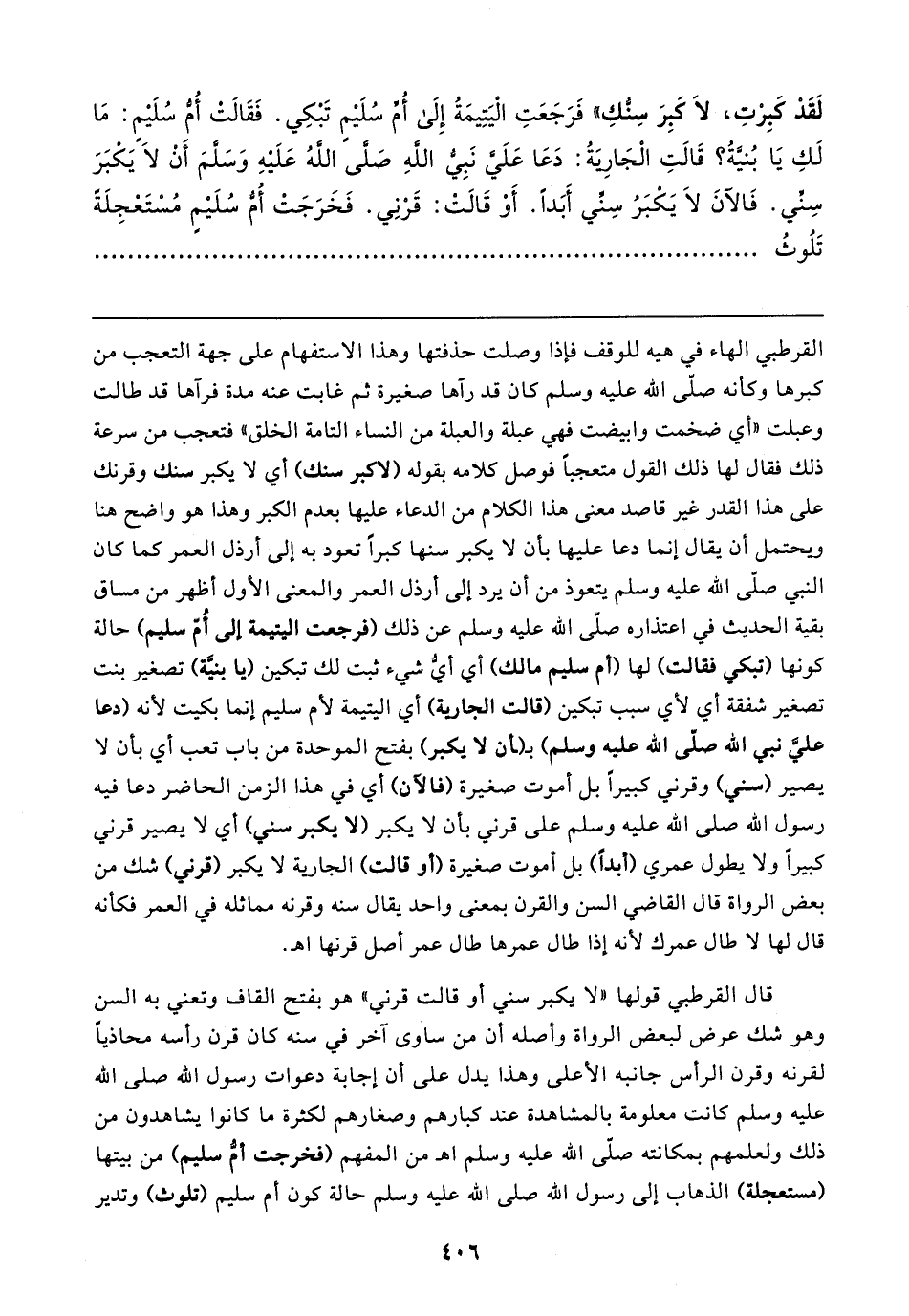لَقَدْ كَبِرْتِ، لَا كَبِرَ سِنُّكِ" فَرَجَعَتِ الْيَتِيمَةُ إِلَى أُمِّ سُلَيمٍ تَبْكِي. فَقَالتْ أُمُّ سُلَيمٍ: مَا لَكِ يَا بُنيَّةُ؟ قَالتِ الْجَارِيَةُ: دَعَا عَلَيَّ نَبِيُّ اللهِ صَلَّى اللهُ عَلَيهِ وَسَلَّمَ أَنْ لَا يَكْبَرَ سِنِّي. فَالآنَ لَا يَكْبَرُ سِنِّي أَبَدًا. أَوْ قَالتْ: قَرْنِي. فَخَرَجَتْ أُمُّ سُلَيمٍ مُسْتَعْجِلَةً تَلُوثُ