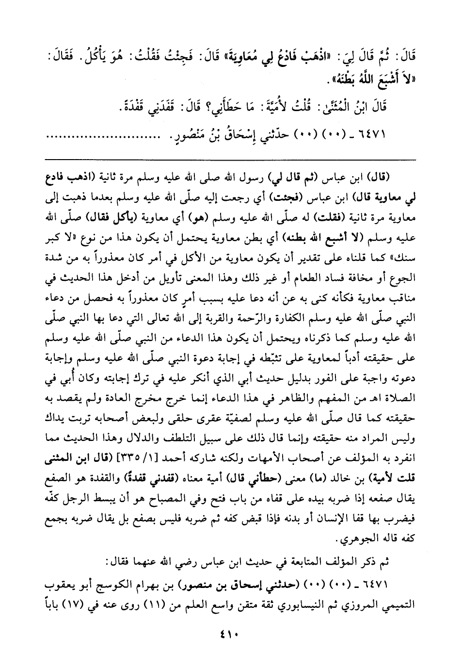 (قال) ابن عباس (ثم قال لي) رسول الله صلى الله عليه وسلم مرة ثانية (اذهب فادع لي معاوية قال) ابن عباس (فجئت) أي رجعت إليه صلى الله عليه وسلم بعدما ذهبت إلى معاوية مرة ثانية (فقلت) له صلى الله عليه وسلم (هو) أي معاوية (يأكل فقال) صلى الله عليه وسلم (لا أشبع الله بطنه) أي بطن معاوية يحتمل أن يكون هذا من نوع "لا كبر سنك" كما قلناه على تقدير أن يكون معاوية من الأكل في أمر كان معذورًا به من شدة الجوع أو مخافة فساد الطعام أو غير ذلك وهذا المعنى تأويل من أدخل هذا الحديث في مناقب معاوية فكأنه كنى به عن أنه دعا عليه بسبب أمرٍ كان معذورًا به فحصل من دعاء النبي صلى الله عليه وسلم الكفارة والرّحمة والقربة إلى الله تعالى التي دعا بها النبي صلّى الله عليه وسلم كما ذكرناه ويحتمل أن يكون هذا الدعاء من النبي صلى الله عليه وسلم على حقيقته أدبًا لمعاوية على تثبّطه في إجابة دعوة النبي صلى الله عليه وسلم وإجابة دعوته واجبة على الفور بدليل حديث أبي الذي أنكر عليه في ترك إجابته وكان أُبي في الصلاة اهـ من المفهم والظاهر في هذا الدعاء إنما خرج مخرج العادة ولم يقصد به حقيقته كما قال صلى الله عليه وسلم لصفيّة عقرى حلقى ولبعض أصحابه تربت يداك وليس المراد منه حقيقته وإنما قال ذلك على سبيل التلطف والدلال وهذا الحديث مما انفرد به المؤلف عن أصحاب الأمهات ولكنه شاركه أحمد [١/ ٣٣٥] (قال ابن المثنى قلت لأمية) بن خالد (ما) معنى (حطأني قال) أمية معناه (قفدني قفدةً) والقفدة هو الصفع يقال صفعه إذا ضربه بيده على قفاه من باب فتح وفي المصباح هو أن يبسط الرجل كفّه فيضرب بها قفا الإنسان أو بدنه فإذا قبض كفه ثم ضربه فليس بصفع بل يقال ضربه بجمع كفه قاله الجوهري.