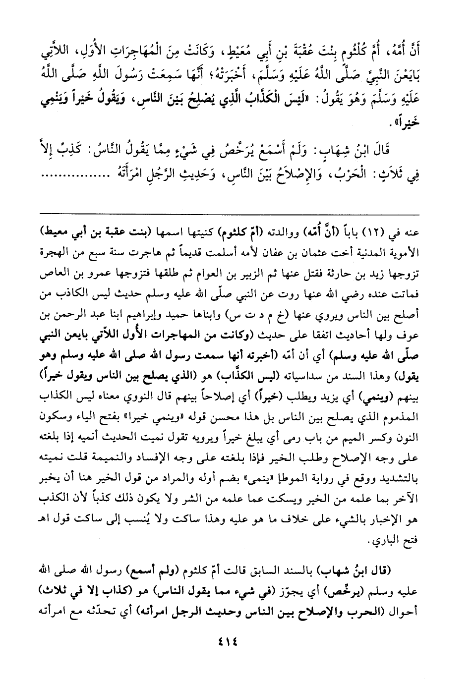 أَنَّ أُمَّهُ، أُمَّ كُلْثُومٍ بِنْتَ عُقْبَةَ بْنِ أَبِي مُعَيطٍ، وَكَانَتْ مِنَ الْمُهَاجِرَاتِ الأُوَلِ، اللَّاتِي بَايَعْنَ النَّبِيَّ صَلَّى اللهُ عَلَيهِ وَسَلَّمَ، أَخْبَرَتْهُ؛ أَنَّهَا سَمِعَتْ رَسُولَ اللهِ صَلَّى اللهُ عَلَيهِ وَسَلَّمَ وَهُوَ يَقُولُ: "لَيسَ الْكَذَّابُ الَّذِي يُصْلِحُ بَينَ النَّاسِ، وَيَقُولُ خَيرًا وَيَنْمِي خَيرًا".