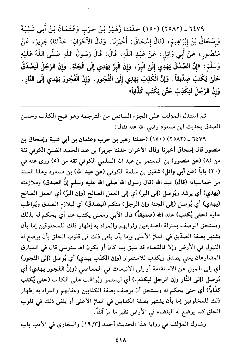 ٦٤٧٩ - (٢٥٨٢) (١٥٠) حدَّثنا زُهَيرُ بْنُ حَرْبٍ وَعُثْمَانُ بْنُ أَبِي شَيبَةَ وَإِسْحَاقُ بْنُ إِبْرَاهِيمَ، (قَال إِسْحَاقُ: أَخْبَرَنَا. وَقَال الآخَرَانِ: حَدَّثَنَا) جَرِيرٌ، عَنْ مَنْصُورٍ، عَنْ أَبِي وَائِلٍ، عَنْ عَبْدِ اللهِ، قَال: قَال رَسُولُ اللهِ صَلَّى اللهُ عَلَيهِ وَسَلَّمَ: "إِنَّ الصِّدْقَ يَهْدِي إِلَى الْبِرِّ، وَإِنَّ الْبِرَّ يَهْدِي إِلَى الْجَنَّةِ. وَإِنَّ الرَّجُلَ لَيَصْدُقُ حَتَّى يُكْتَبَ صِدِّيقًا. وَإِنَّ الْكَذِبَ يَهْدِي إِلَى الْفُجُورِ. وَإِنَّ الْفُجُورَ يَهْدِي إِلَى النَّارِ. وَإِنَّ الرَّجُلَ لَيَكْذِبُ حَتَّى يُكْتَبَ كَذَّابًا"