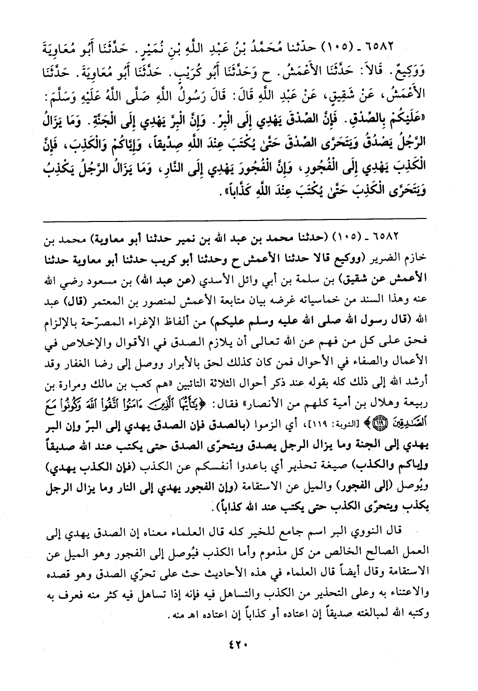 ٦٥٨٢ - (١٠٥) حدَّثنا مُحَمَّدُ بْنُ عَبْدِ اللهِ بْنِ نُمَيرٍ. حَدَّثَنَا أَبُو مُعَاويَةَ وَوَكِيعٌ. قَالا: حَدَّثَنَا الأَعْمَشُ. ح وَحَدَّثَنَا أَبُو كُرَيبٍ. حَدَّثَنَا أَبُو مُعَاويَةَ. حَدَّثَنَا الأَعْمَشُ، عَنْ شَقِيقٍ، عَنْ عَبْدِ اللهِ قَال: قَال رَسُولُ اللهِ صَلَّى اللهُ عَلَيهِ وَسَلَّمَ: "عَلَيكُمْ بِالصِّدْقِ. فَإِنَّ الصِّدْقَ يَهْدِي إِلَى الْبِرِّ. وَإِنَّ الْبِرَّ يَهْدِي إِلَى الْجَنَّةِ. وَمَا يَزَالُ الرَّجُلُ يَصْدُقُ وَيَتَحَرَّى الصِّدْقَ حَتَّى يُكْتَبَ عِنْدَ اللهِ صِدِّيقًا، وَإِيَّاكُمْ وَالْكَذِبَ، فَإِنَّ الْكَذِبَ يَهْدِي إِلَى الْفُجُورِ، وَإِنَّ الْفُجُورَ يَهْدِي إِلَى النَّارِ، وَمَا يَزَالُ الرَّجُلُ يَكْذِبُ وَيتَحَرَّى الْكَذِبَ حَتَّى يُكْتَبَ عِنْدَ اللهِ كَذَّابًا"