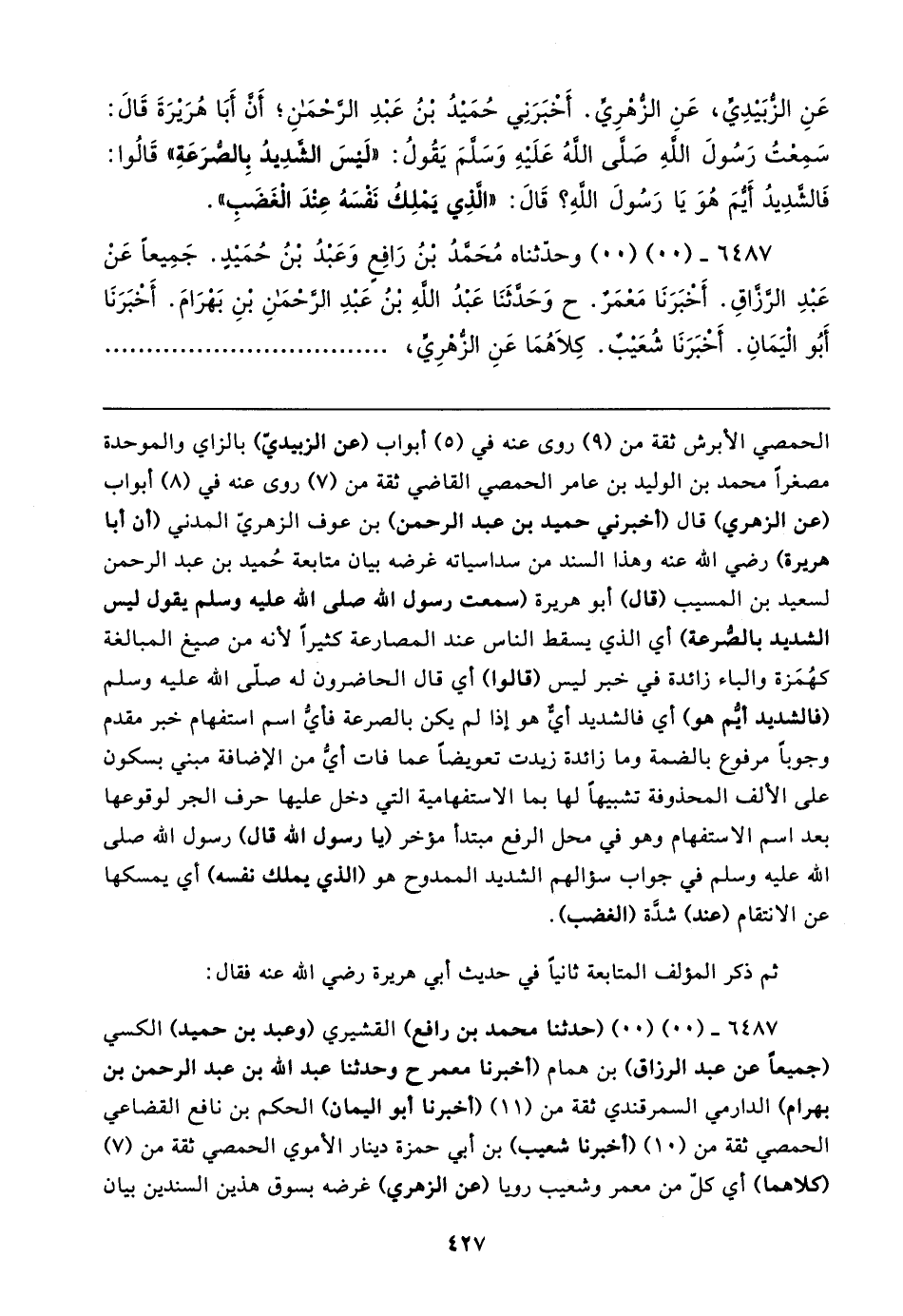عَنِ الزُّبَيدِيِّ، عَنِ الزُّهْرِيِّ. أَخْبَرَنِي حُمَيدُ بْنُ عَبْدِ الرَّحْمَنِ؛ أَنَّ أَبَا هُرَيرَةَ قَال: سَمِعْتُ رَسُولَ الله صلى الله عَلَيهِ وَسَلَّمَ يَقُولُ: "لَيسَ الشَّدِيدُ بِالصُّرَعَةِ" قَالُوا: فَالشَّدِيدُ أَيُّمَ هُوَ يَا رَسُولَ اللهِ؟ قَال: "الَّذِي يَمْلِكُ نَفْسَهُ عِنْدَ الْغَضَبِ".