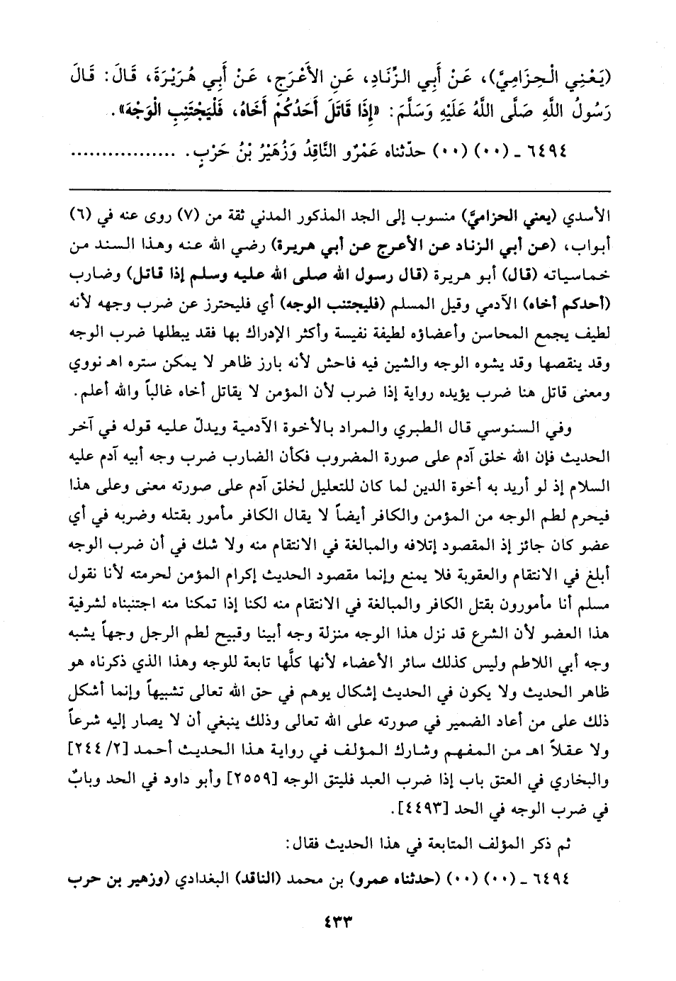 (يَعْنِي الْحِزَامِيَّ)، عَنْ أَبِي الزِّنَادِ، عَنِ الأَعْرَجِ، عَنْ أَبِي هُرَيرَةَ، قَال: قَال رَسُولُ اللهِ صَلَّى اللهُ عَلَيهِ وَسَلَّمَ: "إِذَا قَاتَلَ أَحَدُكُمْ أَخَاهُ، فَلْيَجْتَنِبِ الْوَجْهَ".