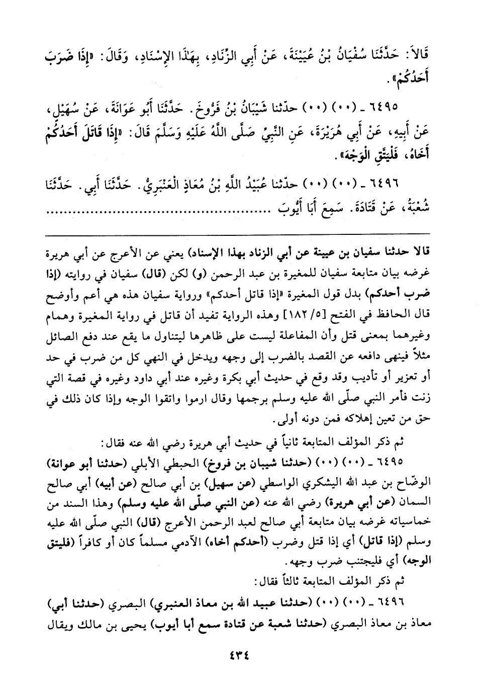 ٦٤٩٥ - (٠٠) (٠٠) (حدثنا شيبان بن فروخ) الحبطي الأبلي (حدثنا أبو عوانة) الوضّاح بن عبد الله اليشكري الواسطي (عن سهيل) بن أبي صالح (عن أبيه) أبي صالح السمان (عن أبي هريرة) رضي الله عنه (عن النبي صلى الله عليه وسلم) وهذا السند من خماسياته غرضه بيان متابعة أبي صالح لعبد الرحمن الأعرج (قال) النبي صلى الله عليه وسلم (إذا قاتل) أي إذا قتل وضرب (أحدكم أخاه) الآدمي مسلمًا كان أو كافرًا (فليتق الوجه) أي فليجتنب ضرب وجهه.