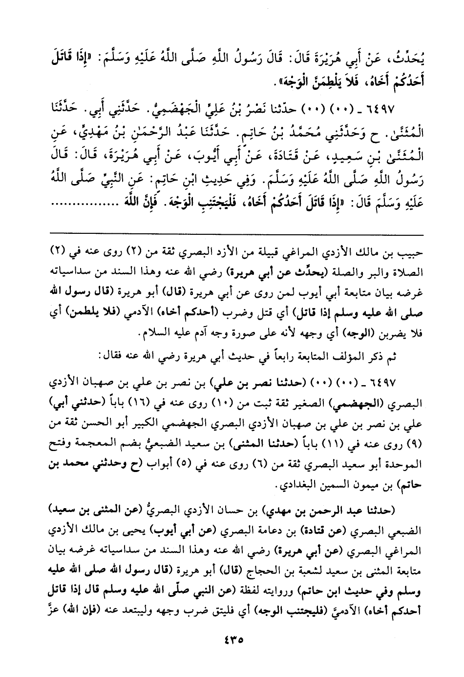 ٦٤٩٧ - (٠٠) (٠٠) حدَّثنا نَصْرُ بْنُ عَلِيٍّ الجهْضَمِيُّ. حَدَّثَنِي أَبِي. حَدَّثَنَا الْمُثَنَّى. ح وَحَدَّثَنِي مُحَمَّدُ بْنُ حَاتِمٍ. حَدَّثَنَا عَبْدُ الرَّحْمَنِ بْنُ مَهْدِيٍّ، عَنِ الْمُثَنَّى بْنِ سَعِيدٍ، عَنْ قَتَادَةَ، عَنْ أَبِي أَيُّوبَ، عَنْ أَبِي هُرَيرَةَ، قَال: قَال رَسُولُ الله صَلَّى اللهُ عَلَيهِ وَسَلَّمَ. وَفِي حَدِيثِ ابْنِ حَاتِمٍ: عَنِ النَّبِيِّ صَلَّى اللهُ عَلَيهِ وَسَلَّمَ قَال: "إِذَا قَاتَلَ أَحَدُكُمْ أَخَاهُ، فَلْيَجْتَنِبِ الْوَجْهَ. فَإِنَّ اللهَ