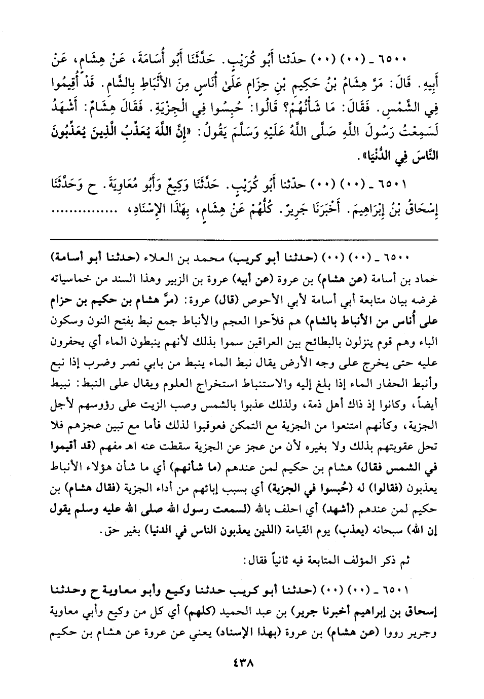 ٦٥٠٠ - (٠٠) (٠٠) حدَّثنا أَبُو كُرَيبٍ. حَدَّثَنَا أَبُو أُسَامَةَ، عَنْ هِشَامٍ، عَنْ أَبِيهِ. قَال: مَرَّ هِشَامُ بْنُ حَكِيمِ بْنِ حِزَامٍ عَلَى أُنَاسٍ مِنَ الأَنْبَاطِ بِالشَّامِ. قَدْ أُقِيمُوا فِي الشَّمْسِ. فَقَال: مَا شَأْنُهُمْ؟ قَالُوا: حُبِسُوا فِي الْجِزْيَةِ. فَقَال هِشَامٌ: أَشْهَدُ لَسَمِعْتُ رَسُولَ اللهِ صَلَّى اللهُ عَلَيهِ وَسَلَّمَ يَقُولُ: "إِنَّ اللهَ يُعَذِّبُ الَّذِينَ يُعَذِّبُونَ النَّاسَ فِي الدُّنْيَا".