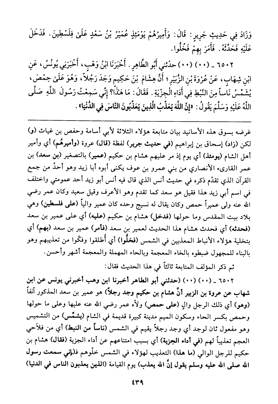 ٦٥٠٢ - (٠٠) (٠٠) حدّثني أَبُو الطَّاهِرِ. أَخْبَرَنَا ابْنُ وَهْبٍ، أَخْبَرَنِي يُونُسُ، عَنِ ابْنِ شِهَابٍ، عَنْ عُرْوَةَ بْنِ الزُّبَيرِ؛ أَنَّ هِشَامَ بْنَ حَكِيمٍ وَجَدَ رَجُلًا، وَهُوَ عَلَى حِمْصَ، يُشَمِّسُ نَاسًا مِنَ النَّبْطِ فِي أَدَاءِ الْجزْيَةِ. فَقَال: مَا هَذَا؟ إِنِّي سَمِعْتُ رَسُولَ اللهِ صَلَّى اللهُ عَلَيهِ وَسَلَّمَ يَقُولُ: "إِنَّ اللهَ يُعَذِّبُ الَّذِينَ يُعَذِّبُونَ النَّاسَ فِي الدُّنْيَا"