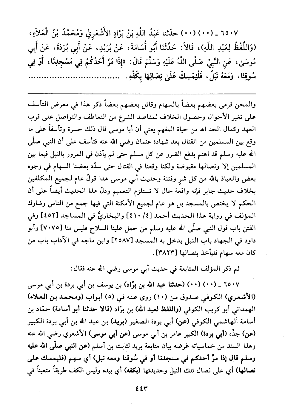 ٦٥٠٧ - (٠٠) (٠٠) (حدثنا عبد الله بن برّاد) بن يوسف بن أبي بردة بن أبي موسى (الأشعري) الكوفي صدوق من (١٠) روى عنه في (٥) أبواب (ومحمد بن العلاء) الهمداني أبو كريب الكوفي (واللفظ لعبد الله) بن برّاد (قالا حدثنا أبو أسامة) حمّاد بن أسامة الهاشمي الكوفي (عن) أبي بردة الصغير (بريد) بن عبد الله بن أبي بردة الكبير (عن) جدِّه (أبي بردة) الكبير عامر بن أبي موسى (عن أبي موسى) الأشعري رضي الله عنه وهذا السند من خماسياته غرضه بيان متابعة بريد لثابت بن أسلم (عن النبي صلى الله عليه وسلم قال إذا مرَّ أحدكم في مسجدنا أو في سُوقنا ومعه نبل) أي سهم (فليمسك على نصالها) أي على نصال تلك النبل وحديدتها (بكفه) أي بيده وليس الكف طريقًا متعينًا في