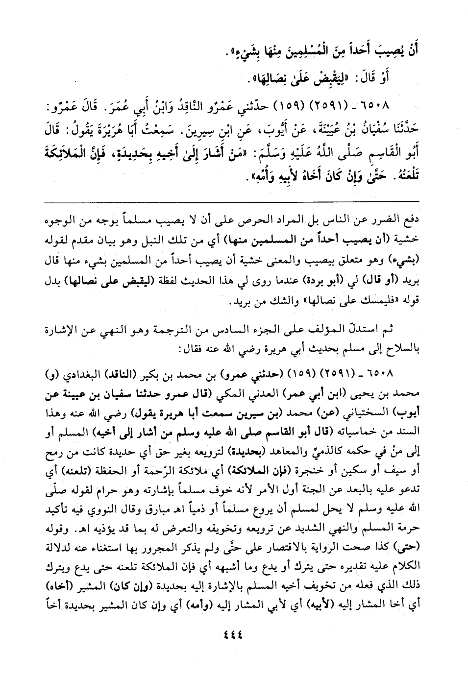 ٦٥٠٨ - (٢٥٩١) (١٥٩) حدّثني عَمْرٌو النَّاقِدُ وَابْنُ أَبِي عُمَرَ. قَال عَمْرٌو: حَدَّثَنَا سُفْيَانُ بْنُ عُيَينَةَ، عَنْ أَيُّوبَ، عَنِ ابْنِ سِيرِينَ. سَمِعْتُ أَبَا هُرَيرَةَ يَقُولُ: قَال أَبُو الْقَاسِمِ صَلَّى اللهُ عَلَيهِ وَسَلَّمَ: "مَنْ أَشَارَ إِلَى أَخِيهِ بِحَدِيدَةٍ، فَإِنَّ الْمَلائِكَةَ تَلْعَنُهُ. حَتَّى وَإِنْ كَانَ أَخَاهُ لأَبِيهِ وَأُمِّهِ"