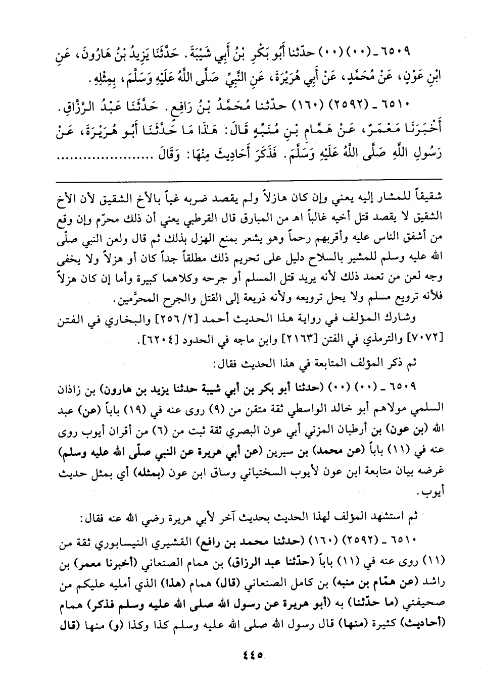 ٦٥٠٩ - (٠٠) (٠٠) (حدثنا أبو بكر بن أبي شيبة حدثنا يزيد بن هارون) بن زاذان السلمي مولاهم أبو خالد الواسطي ثقة متقن من (٩) روى عنه في (١٩) بابا (عن) عبد الله (بن عون) بن أرطبان المزني أبي عون البصري ثقة ثبت من (٦) من أقران أيوب روى عنه في (١١) بابا (عن محمد) بن سيرين (عن أبي هريرة عن النبي صلى الله عليه وسلم) غرضه بيان متابعة ابن عون لأيوب السختياني وساق ابن عون (بمثله) أي بمثل حديث أيوب.