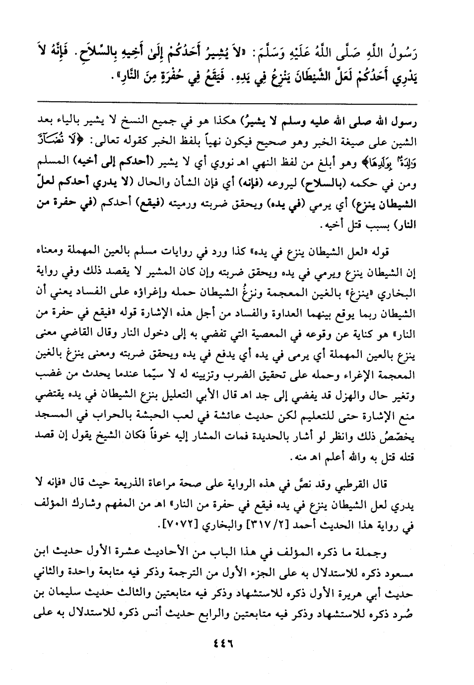 رَسُولُ اللهِ صَلَّى اللهُ عَلَيهِ وَسَلَّمَ: "لَا يُشِيرُ أَحَدُكمُ إِلَى أَخِيهِ بِالسِّلَاحِ. فَإِنَّهُ لَا يَدْرِي أَحَدُكُمْ لَعَلَّ الشَّيطَانَ يَنْزِعُ فِي يَدِهِ. فَيَقَعُ فِي حُفْرَةٍ مِنَ النَّارِ"