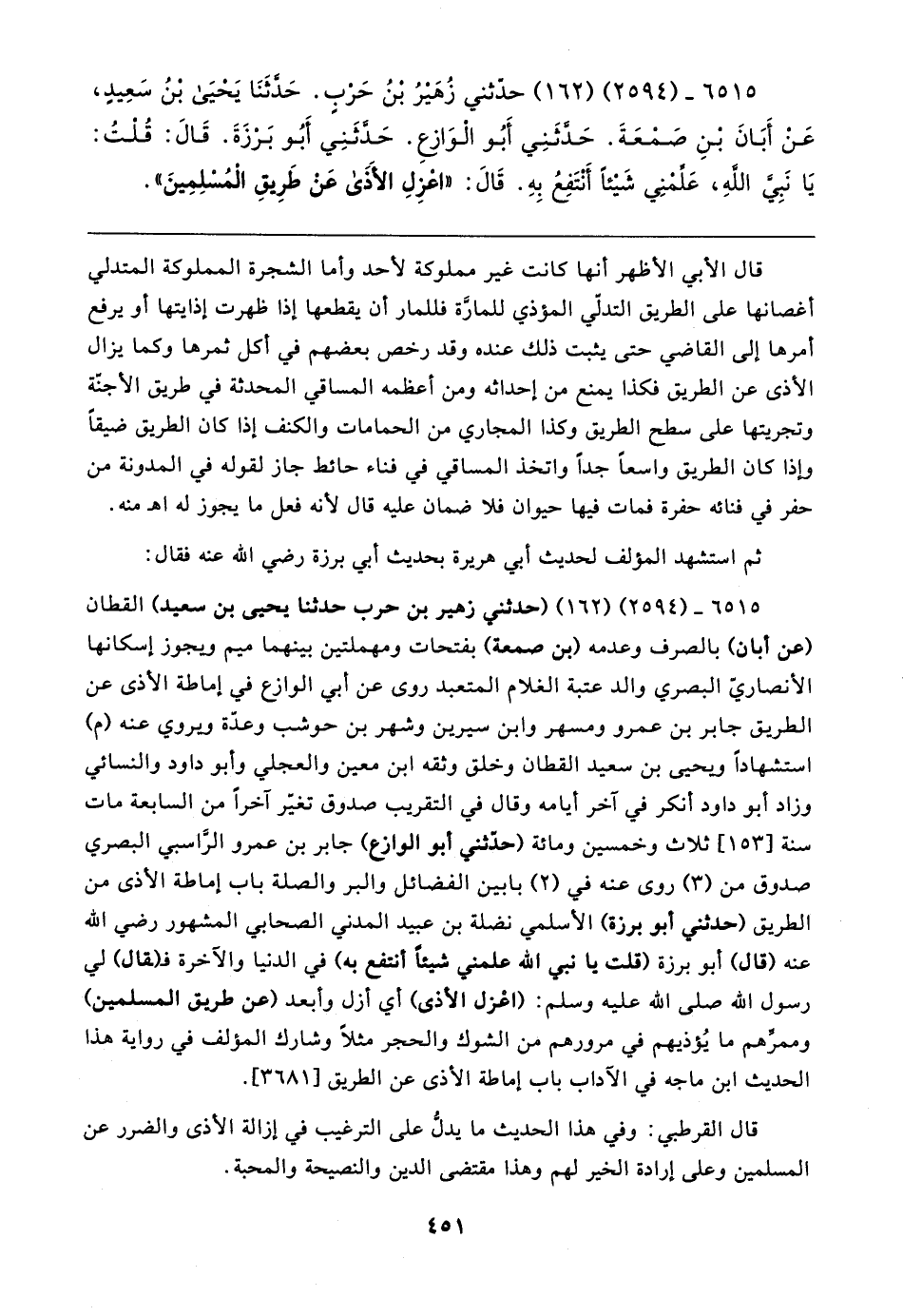 ٦٥١٥ - (٢٥٩٤) (١٦٢) (حدثني زهير بن حرب حدثنا يحيى بن سعيد) القطان (عن أبان) بالصرف وعدمه (بن صمعة) بفتحات ومهملتين بينهما ميم ويجوز إسكانها الأنصاريّ البصري والد عتبة الغلام المتعبد روى عن أبي الوازع في إماطة الأذى عن الطريق جابر بن عمرو ومسهر وابن سيرين وشهر بن حوشب وعدّة ويروي عنه (م) استشهادًا ويحيى بن سعيد القطان وخلق وثقه ابن معين والعجلي وأبو داود والنسائي وزاد أبو داود أنكر في آخر أيامه وقال في التقريب صدوق تغيَّر آخرًا من السابعة مات سنة [١٥٣] ثلاث وخمسين ومائة (حدثني أبو الوازع) جابر بن عمرو الرَّاسبي البصري صدوق من (٣) روى عنه في (٢) بابين الفضائل والبر والصلة باب إماطة الأذى من الطريق (حدثني أبو برزة) الأسلمي نضلة بن عبيد المدني الصحابي المشهور رضي الله عنه (قال) أبو برزة (قلت يا نبي الله علمني شيئًا أنتفع به) في الدنيا والآخرة فـ (ـقال) لي رسول الله صلى الله عليه وسلم: (اعْزل الأذى) أي أزل وأبعد (عن طريق المسلمين) وممرِّهم ما يُؤذيهم في مرورهم من الشوك والحجر مثلًا وشارك المؤلف في رواية هذا الحديث ابن ماجه في الآداب باب إماطة الأذى عن الطريق [٣٦٨١].