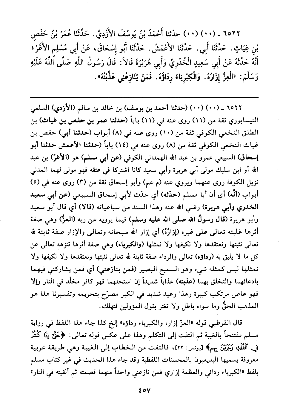٦٥٢٢ - (٠٠) (٠٠) (حدثنا أحمد بن يوسف) بن خالد بن سالم (الأزدي) السلمي النيسابوري ثقة من (١١) روى عنه في (١١) بابا (حدثنا عمر بن حفص بن غياث) بن الطلق النخعي الكوفي ثقة من (١٠) روى عنه في (٨) أبواب (حدثنا أبي) حفص بن غياث النخعي الكوفي ثقة من (٨) روى عنه في (١٤) بابا (حدثنا الأعمش حدثنا أبو إسحاق) السبيعي عمرو بن عبد الله الهمداني الكوفي (عن أبي مسلم) هو (الأغرّ) بن عبد الله أو ابن سليك مولى أبي هريرة وأبي سعيد كانا اشتركا في عتقه فهو مولى لهما المدني نزيل الكوفة روى عنهما ويروي عنه (م عم) وأبو إسحاق ثقة من (٣) روى عنه في (٥) أبواب (أنَّه) أي أن أبا مسلم (حدّثه) أي حدّث لأبي إسحاق السبيعي (عن أبي سعيد الخدري وأبي هريرة) رضي الله عنه وهذا السند من سباعياته (قالا) أي قال أبو سعيد وأبو هريرة (قال رسولُ الله صلى الله عليه وسلم) فيما يرويه عن ربه (العزُّ) وهي صفة أثرها غلبته تعالى على غيره (إزارُهُ) أي إزار الله سبحانه وتعالى والإزار صفة ثابتة لله تعالى نثبتها ونعتقدها ولا نكيفها ولا نمثلها (والكبرياء) وهي صفة أثرها تنزهه تعالى عن كل ما لا يليق به (رداؤه) تعالى والرداء صفة ثابتة لله تعالى نثبتها ونعتقدها ولا نكيفها ولا نمثلها ليس كمثله شيء وهو السميع البصير (فمن ينازعني) أي فمن يشاركني فيهما بادعائهما والتخلق بهما (عذبته) عذابًا شديدًا إن استحلهما فهو كافر مخلّد في النار وإلا فهو عاص مرتكب كبيرة وهذا وعيد شديد في الكبر مصرّح بتحريمه وتفسيرنا هذا هو المذهب الحقُّ وما سواه باطل ولا تغتر بقول المؤولين فتهلك.