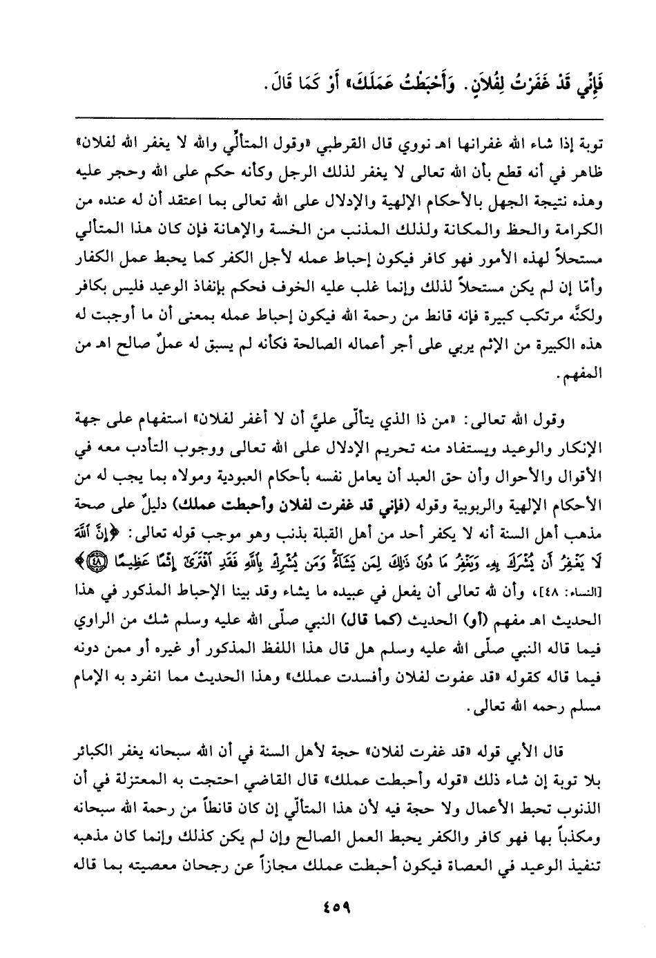 قال الأبي قوله "قد غفرت لفلان" حجة لأهل السنة في أن الله سبحانه يغفر الكبائر بلا توبة إن شاء ذلك "قوله وأحبطت عملك" قال القاضي احتجت به المعتزلة في أن الذنوب تحبط الأعمال ولا حجة فيه لأن هذا المتألّي إن كان قانطًا من رحمة الله سبحانه ومكذبًا بها فهو كافر والكفر يحبط العمل الصالح وإن لم يكن كذلك وإنما كان مذهبه تنفيذ الوعيد في العصاة فيكون أحبطت عملك مجازًا عن رجحان معصيته بما قاله