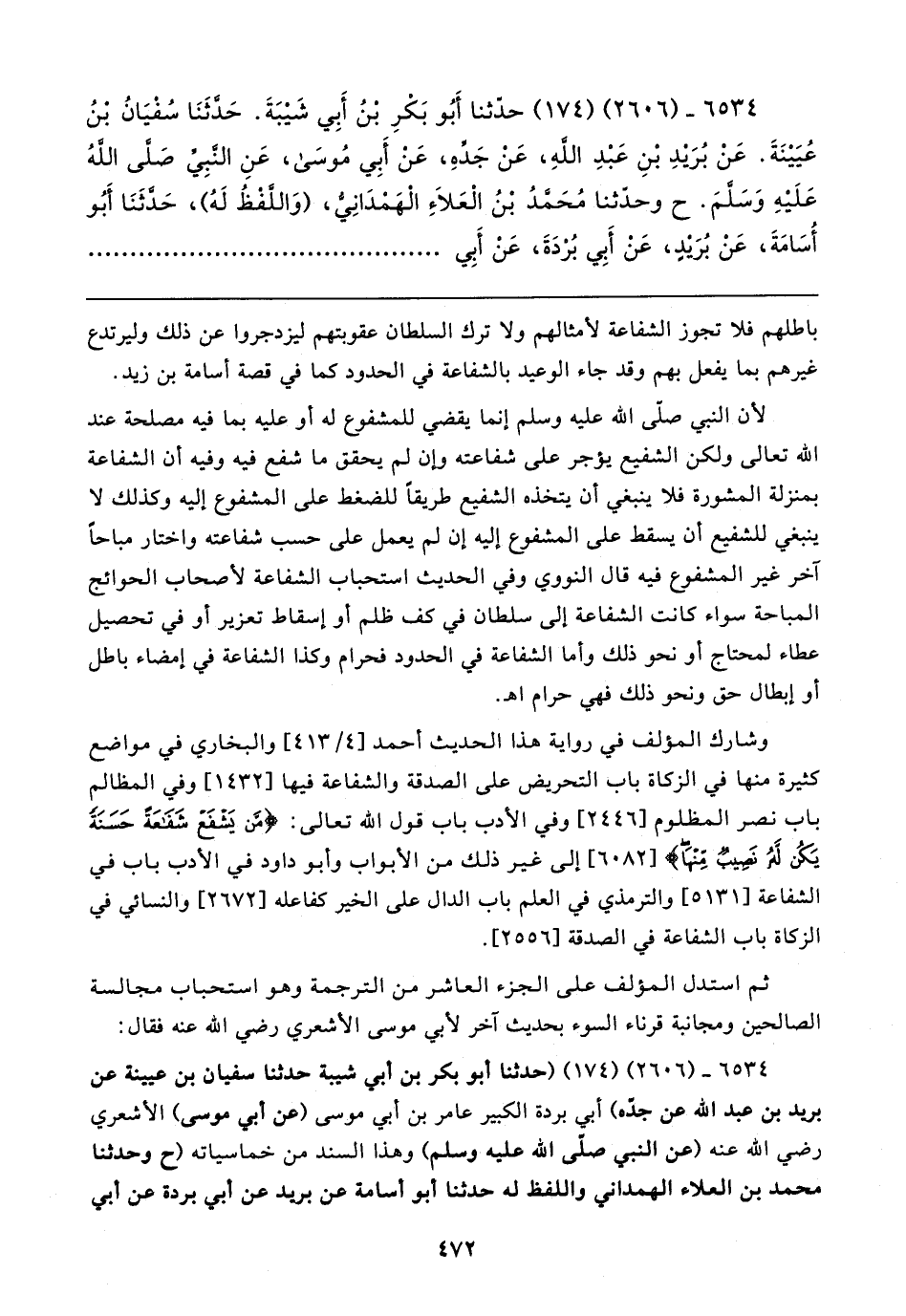 ٦٥٣٤ - (٢٦٠٦) (١٧٤) (حدثنا أبو بكر بن أبي شيبة حدثنا سفيان بن عيينة عن بريد بن عبد الله عن جدّه) أبي بردة الكبير عامر بن أبي موسى (عن أبي موسى) الأشعري رضي الله عنه (عن النبي صلى الله عليه وسلم) وهذا السند من خماسياته (ح وحدثنا محمَّد بن العلاء الهمداني واللفظ له حدثنا أبو أسامة عن بريد عن أبي بردة عن أبي