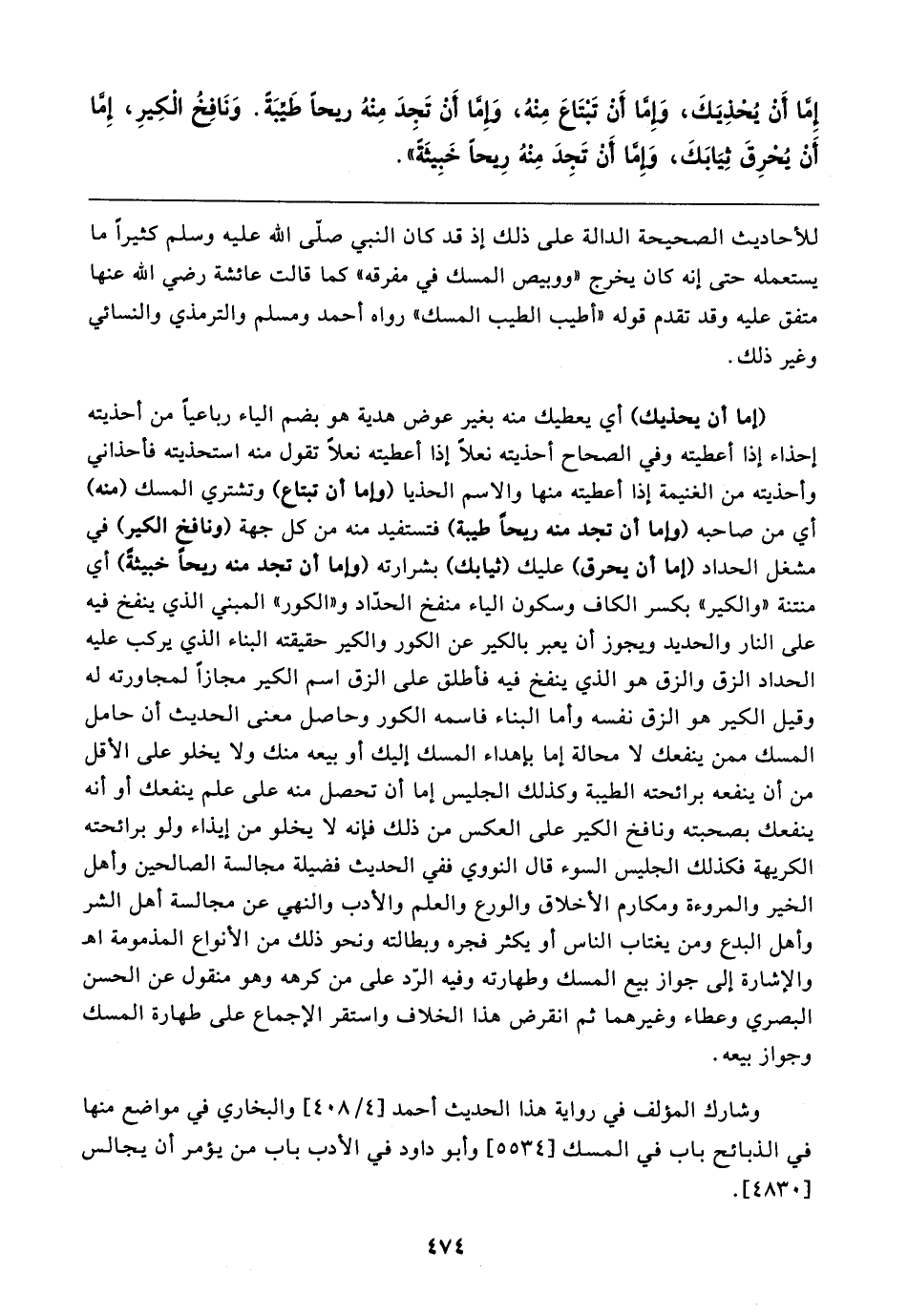 إما أن يُحذِيَكَ، وَإمَّا أَن تَبتَاعَ مِنْهُ، وَإِمَّا أن تَجِدَ مِنْهُ ريحًا طَيبَة. وَنَافِخُ الكِيرِ، إما أَنْ يُحْرِقَ ثِيَابَكَ، وَإِمَّا أَنْ تَجِدَ مِنْهُ رِيحًا خَبِيثَة"