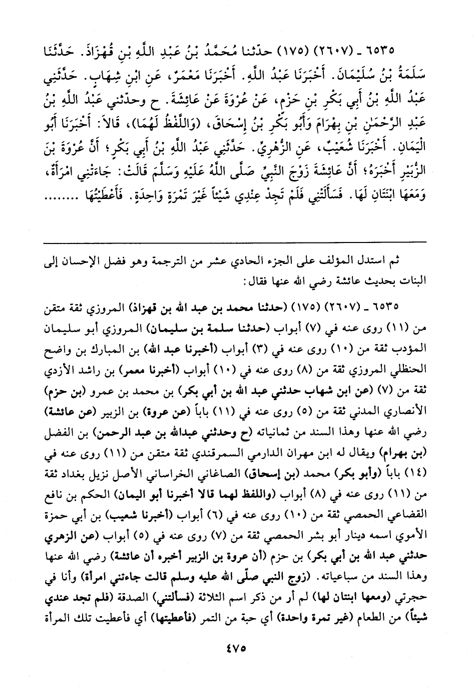 ٦٥٣٥ - (٢٦٠٧) (١٧٥) حدثنا محمد بْنُ عَبْدِ الله بْنِ قُهْزَاذَ. حَدَّثَنَا سَلَمَةُ بْنُ سُلَيمَانَ. أخبَرَنَا عَبْدُ الله. أَخبَرَنَا مَعْمَر، عَنِ ابْنِ شِهَابٍ. حَدثني عَبْدُ الله بْنُ أَبِي بَكرِ بْنِ حَزْمٍ، عَنْ عُرْوَةَ عَنْ عَائِشَةَ. ح وحدّثني عَبدُ الله بْنُ عَبْدِ الرَّحْمَنِ بْنِ بِهرَامَ وَأَبُو بَكرِ بْنُ إِسْحَاقَ، (وَاللَّفْظُ لَهُمَا)، قَالا: أخبَرَنَا أبُو الْيَمَانِ. أَخبَرَنَا شُعَيبٌ، عَنِ الزهْرِيّ. حَدَّثَنِي عَبْدُ الله بْنُ أبي بَكرٍ؛ أَن عُرْوَةَ بْنَ الزُّبَيرِ أَخبَرَهُ؛ أَن عَائِشَةَ زَوْجَ النبي صلى الله عَلَيهِ وَسلَّمَ قَالت: جَاءَتنِي امرَأَةٌ، وَمَعَهَا ابْنَتَانِ لَهَا. فَسَأَلَتْنِي فَلَمْ تَجِدْ عِنْدِي شَيئًا غَيرَ تَمْرَةٍ وَاحِدَةٍ. فَأعْطَيتُهَا