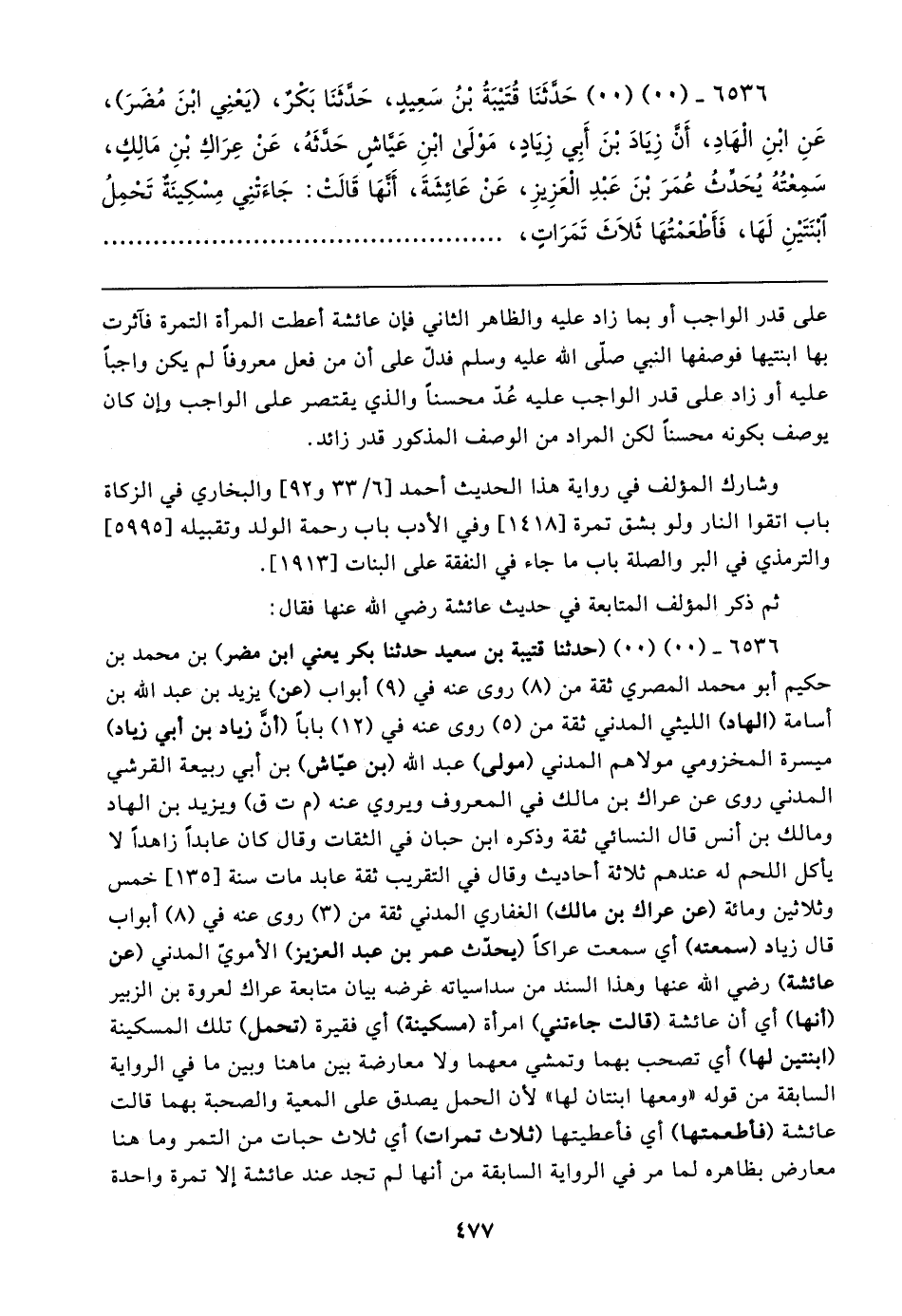 ٦٥٣٦ - (٠٠) (٠٠) حَدَّثَنَا قُتَيبَةُ بْنُ سَعِيدٍ، حَدَّثَنَا بَكْرٌ، (يعني ابْنَ مُضَرَ)، عَنِ ابْنِ الْهَادِ، أَن زِيادَ بْنَ أَبِي زِيادٍ، مَوْلَى ابْنِ عَيَّاشٍ حدثهُ، عَنْ عِرَاكِ بْنِ مَالِكٍ، سَمِعْتُهُ يحدث عُمَرَ بْنَ عَبْدِ العَزِيزِ، عَنْ عَائِشَةَ، أَنهَا قَالتْ: جَاءَتْنِي مِسْكِينَة تَحْمِلُ ابْنَتَينِ لَهَا، فَأطْعَمْتُهَا ثَلاثَ تَمَرَاتٍ،
