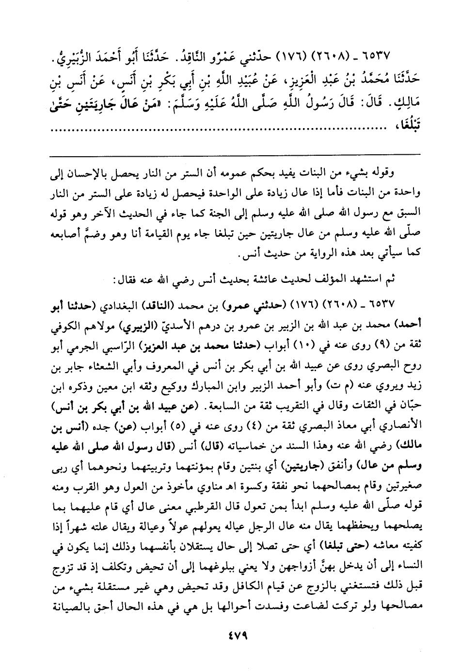 ٦٥٣٧ - (٢٦٠٨) (١٧٦) حدّثني عَمْرٌو الناقِدُ. حَدَّثَنَا أبُو أحْمَدَ الزبَيرِيُّ. حَدَّثَنَا محمد بْنُ عَبْدِ الْعَزِيزِ، عَنْ عُبَيدِ الله بْنِ أَبِي بَكْرِ بْنِ أَنسٍ، عَنْ أَنَسِ بْنِ مَالِكٍ. قَال: قَال رَسُولُ الله صلى الله عَلَيهِ وَسلمَ: "مَنْ عَال جَارِيَتَينِ حَتى تَبْلُغَا،