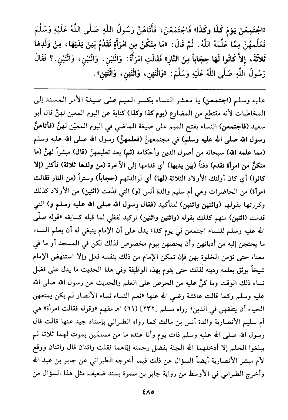"اجْتَمِعْنَ يَوْمَ كَذَا وكَذَا" فَاجْتَمَعْنَ، فَأَتَاهُنَّ رَسُولُ الله صلى الله عَلَيهِ وَسَلَّمَ فَعَلَّمهُن مِمَّا عَلَّمَهُ الله. ثُمَّ قَال: "مَا مِنْكُنَّ مِنِ امْرَأَة تُقَدِّمُ بَينَ يَدَيهَا، مِنْ وَلَدِهَا ثَلاثةً، إلا كَانُوا لَهَا حِجَابًا مِنَ النَّارِ" فَقَالتِ امْرَأَةٌ: وَاثْنَينِ. وَاثْنَينِ، وَاثْنَينِ.؟ فَقَال رَسُولُ الله صلى الله عَلَيهِ وَسلمَ: "وَاثْنَينِ، وَاثْنَينِ، وَاثنَينِ"