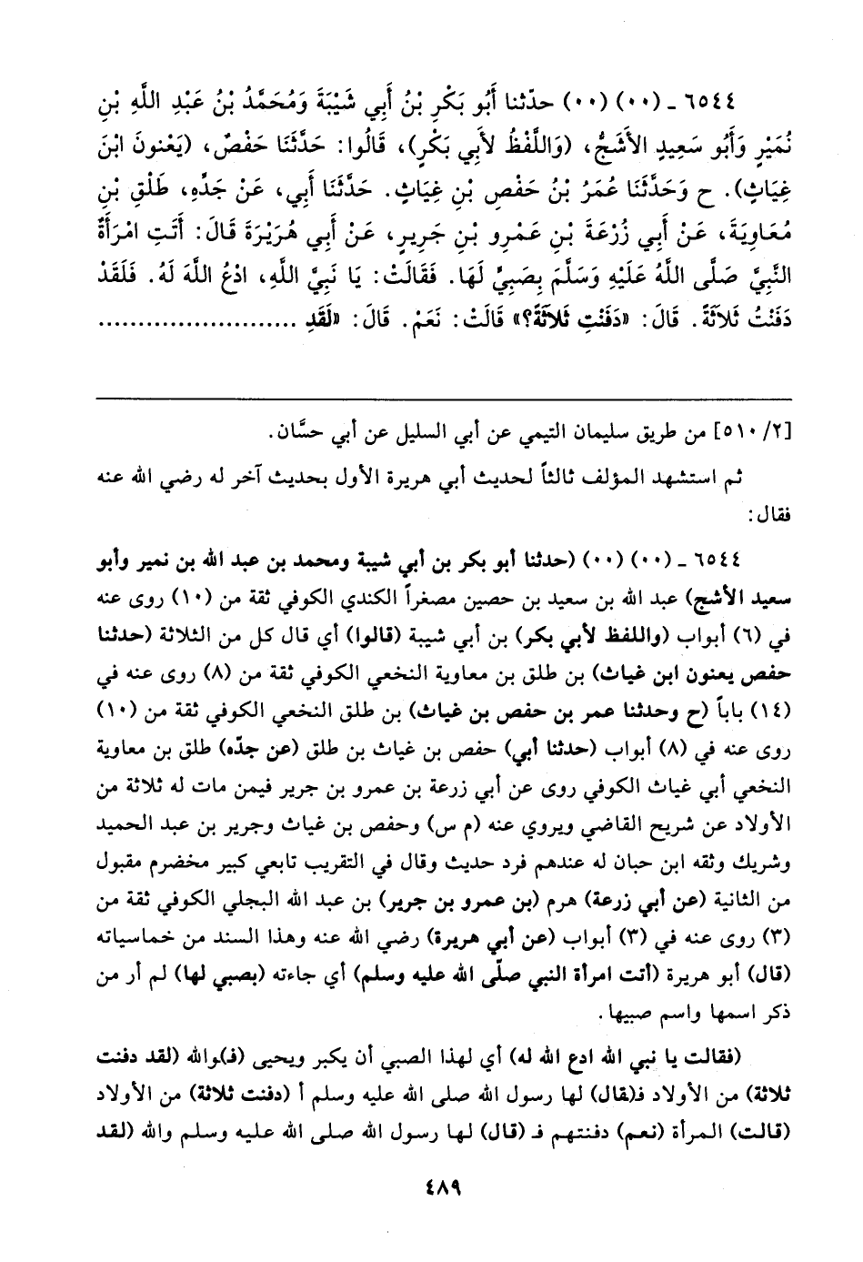 ٦٥٤٤ - (٠٠) (٠٠) حدثنا أَبُو بَكرِ بْنُ أَبِي شَيبَةَ وَمُحَمَّدُ بْنُ عَبْدِ الله بْنِ نُمَيرٍ وَأَبُو سَعِيدٍ الأَشَجُّ، (وَاللَّفْظُ لأَبِي بَكرٍ)، قَالُوا: حَدَّثَنَا حَفْصٌ، (يَعْنونَ ابْنَ غِيَاثٍ). ح وَحَدَّثَنَا عُمَرُ بْنُ حَفْصِ بْنِ غِيَاثٍ. حَدَّثَنَا أَبِي، عَنْ جدهِ، طَلْقِ بْنِ مُعَاويةَ، عَنْ أَبِي زُرْعَةَ بْنِ عَمْرِو بْنِ جَرِيرٍ، عَنْ أَبِي هُرَيرَةَ قَال: أَتَتِ امْرَأَةٌ النَّبيَّ صَلَّى الله عَلَيهِ وَسلمَ بِصَبِيٍّ لَهَا. فَقَالتْ: يَا نَبِي الله، ادع الله لَهُ. فَلَقَدْ دَفَنْتُ ثَلاثةً. قَال: "دَفَنْتِ ثَلاثةً؟ " قَالت: نَعَم. قَال: "لَقَدِ