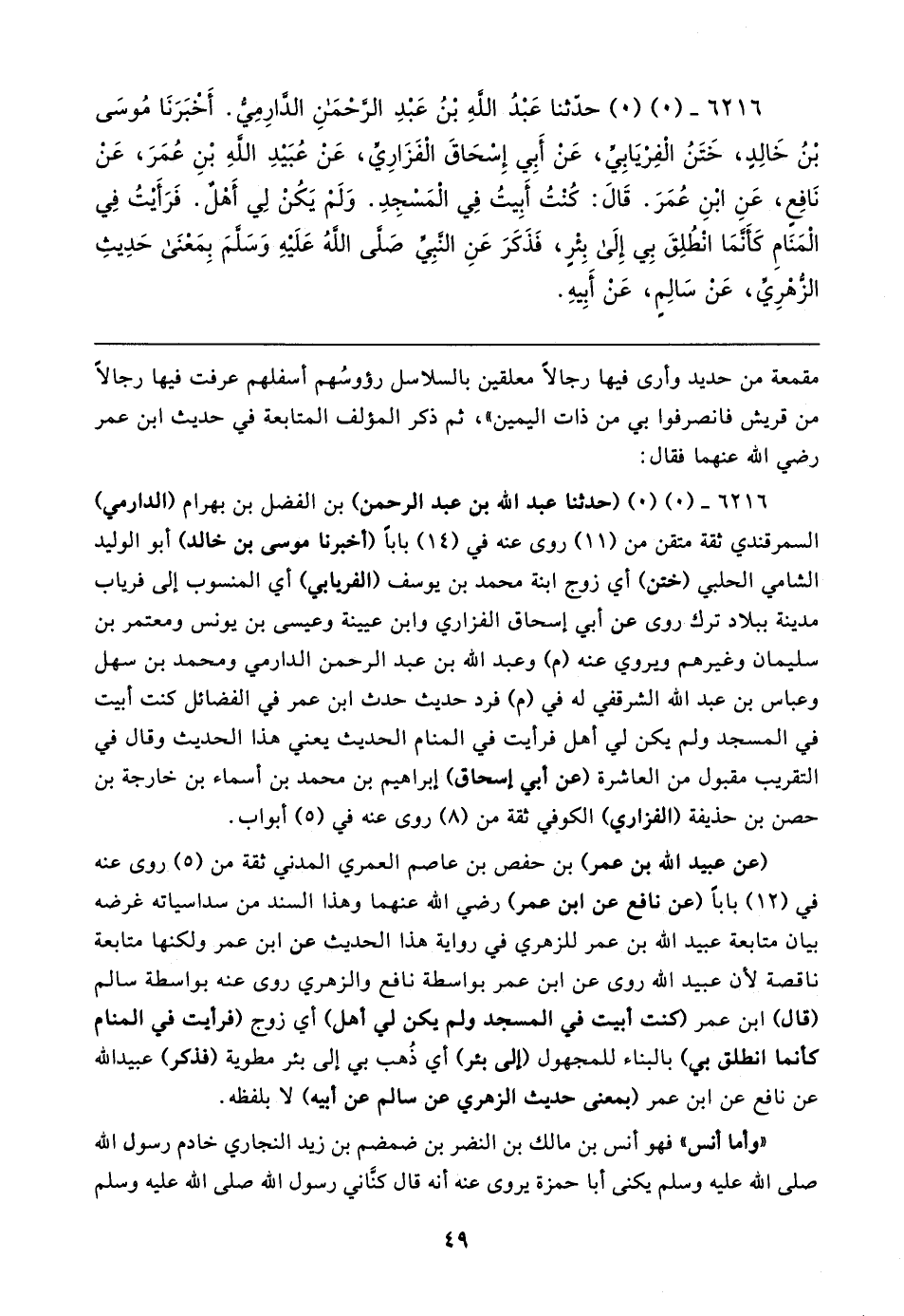 ٦٢١٦ - (٠) (٠) حدَّثنا عَبْدُ اللهِ بْنُ عَبْدِ الرَّحْمَنِ الدَّارِمِيُّ. أَخْبَرَنَا مُوسَى بْنُ خَالِدٍ، خَتَنُ الْفِرْيَابِيِّ، عَنْ أَبِي إِسْحَاقَ الْفَزَارِيِّ، عَنْ عُبَيدِ اللهِ بْنِ عُمَرَ، عَنْ نَافِعٍ، عَنِ ابْنِ عُمَرَ. قَال: كُنْتُ أَبِيتُ فِي الْمَسْجِدِ. وَلَمْ يَكُنْ لِي أَهْلٌ. فَرَأَيتُ فِي الْمَنَامِ كَأَنَّمَا انْطُلِقَ بِي إِلَى بِئْرٍ، فَذَكَرَ عَنِ النَّبِيِّ صَلَّى اللهُ عَلَيهِ وَسَلَّمَ بِمَعْنَى حَدِيثِ الزُّهْرِيِّ، عَنْ سَالِمٍ، عَنْ أَبِيهِ